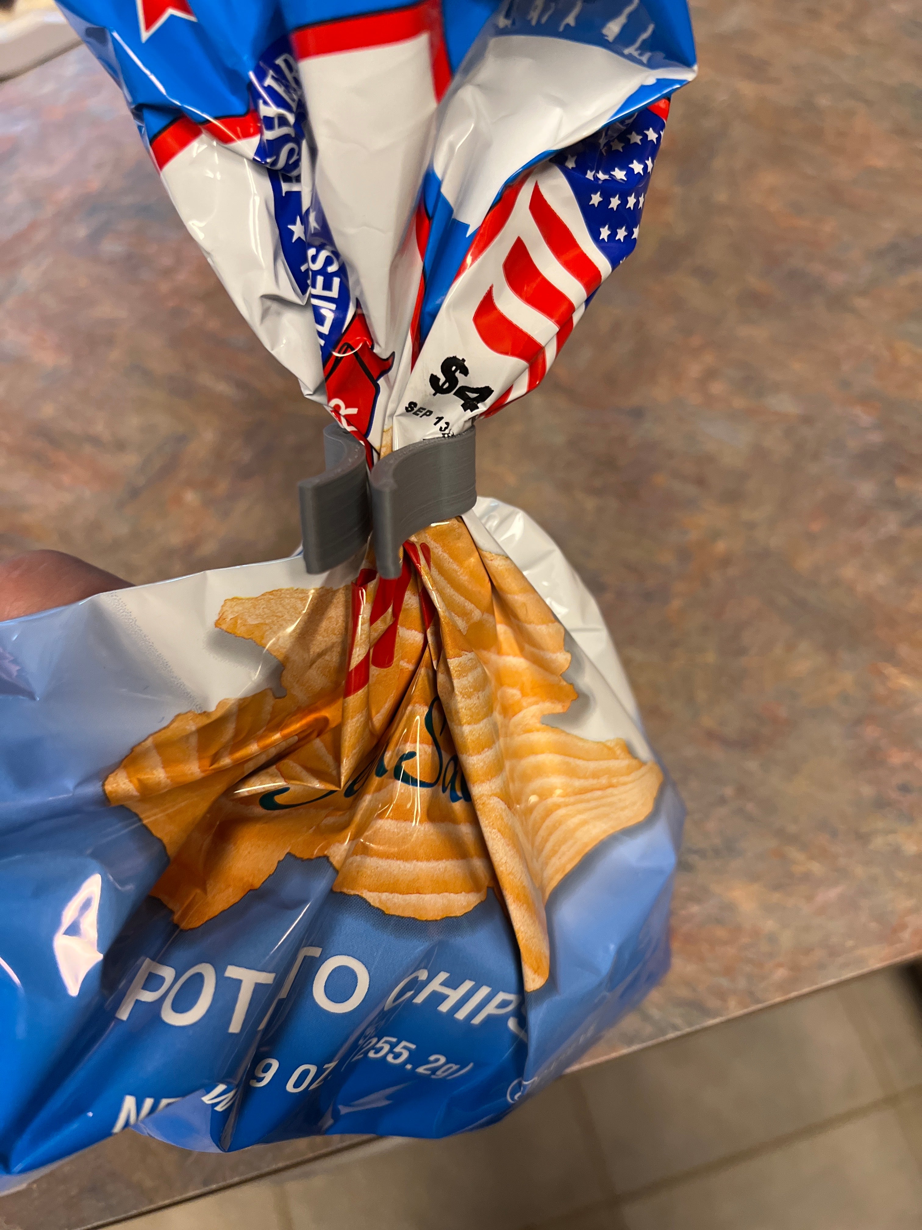 Una semplice clip per borse progettata per tenere chiuse le borse. Funziona bene per i sacchetti di patatine e aiuta a mantenere freschi gli snack. Non è ancora stato testato su altri prodotti.