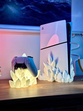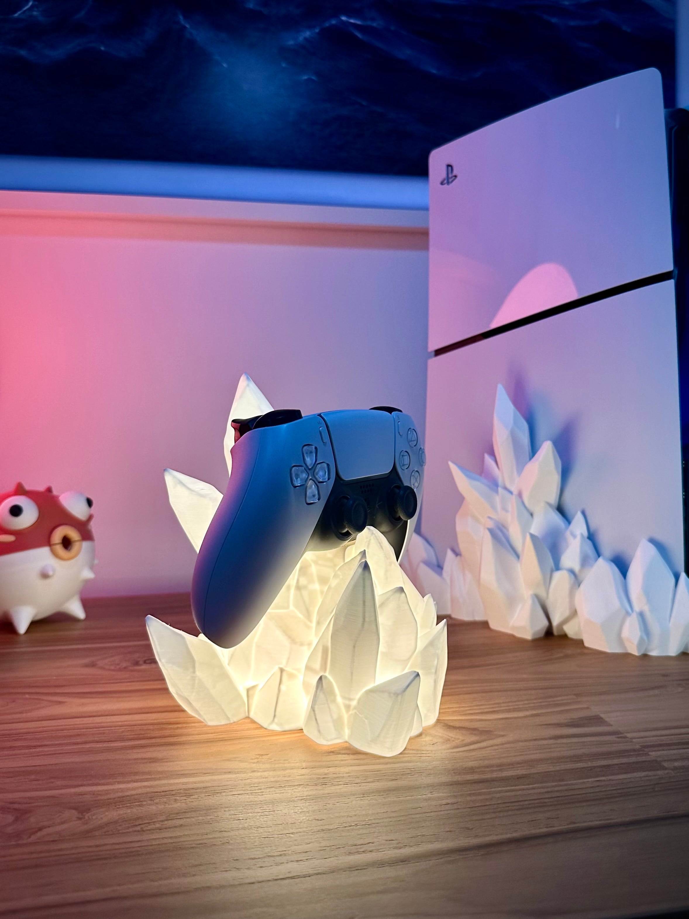Questo supporto è progettato per esporre e organizzare elegantemente i tuoi controller di gioco. La struttura cristallina con illuminazione a LED integrata crea un bagliore sottile che migliora l'atmosfera della tua configurazione di gioco. È un modo elegante per mantenere accessibili i controller e aggiunge un elemento visivo unico.