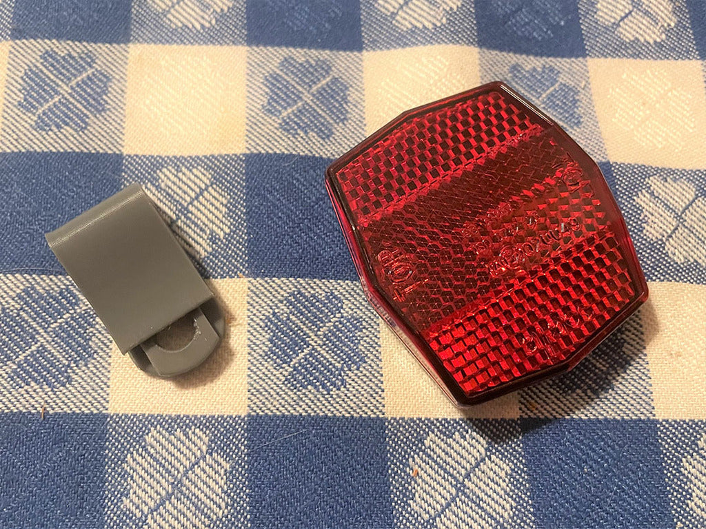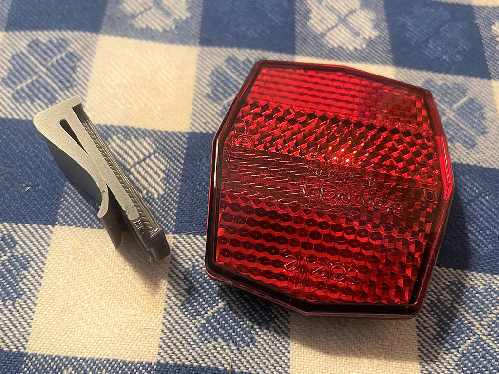 Assicurati che il riflettore della tua bici sia sempre al suo posto con questa clip per riflettore per bici (portapalline) intelligente per borse e borse da sella. Questa clip è progettata per fissare facilmente il tuo riflettore per bici standard al tuo zaino, borsa da sella o marsupio, in modo da poter pedalare in modo sicuro e visibile in qualsiasi momento. La clip è realizzata in PLA standard e si adatta perfettamente al tuo riflettore.