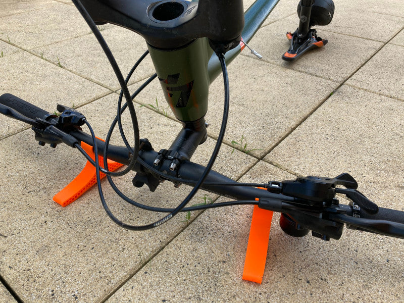 Il cavalletto è montato sul manubrio della bicicletta e consente di capovolgere facilmente la bicicletta, in modo da avere pieno accesso a tutti i componenti. È compatibile con manubri con un diametro di 23 mm, garantendo un fissaggio stabile e sicuro durante il lavoro.