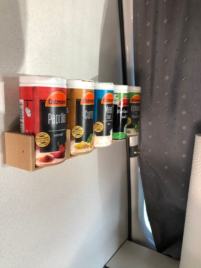 Questo portaspezie offre una soluzione semplice ed efficace per lo stoccaggio delle spezie, sia a casa che in viaggio. Che sia montato in cucina o in un VW Bus Camper, mantiene le tue spezie organizzate e a portata di mano. Il design garantisce che le bottiglie siano stabili, il che è un vantaggio quando si guida in un camper. Lo scaffale contribuisce a massimizzare lo spazio ed è compatibile con i marchi di flaconi di spezie mostrati nelle immagini, fornendo una soluzione di archiviazione personalizzata.