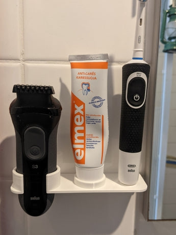Questo pratico supporto a parete è progettato per ottimizzare lo spazio nel tuo bagno e tenere organizzati i tuoi articoli per la cura personale quotidiana. Con spazio per uno spazzolino elettrico, un tubetto di dentifricio e il tuo rasoio elettrico, questo supporto assicura che i tuoi oggetti essenziali siano sempre a portata di mano e ben riposti.
