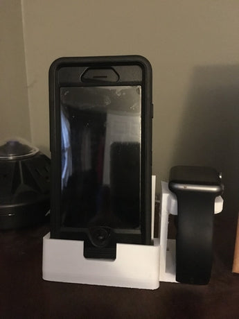 Questa pratica stazione di ricarica è progettata per fornire una soluzione organizzata per il tuo iPhone 6 e il tuo Apple Watch. Si adatta specificamente a un iPhone 6, anche quando è dotato di una robusta cover Otterbox, e offre allo stesso tempo uno spazio dedicato per il tuo Apple Watch.