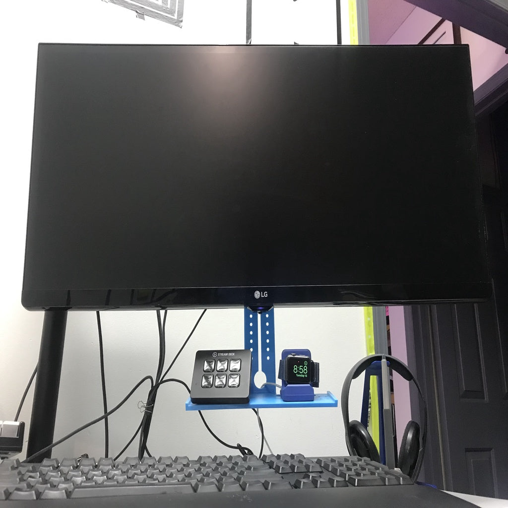 Il ripiano è ideale per tenere traccia del caricatore del tuo Apple Watch, del tuo Elgato Stream Deck Mini e del tuo telefono, ma c'è anche ampio spazio per penne, post-it e altri piccoli oggetti. Inoltre, i fori integrati garantiscono un'efficace gestione dei cavi, in modo che i tuoi cavi siano tenuti ordinatamente fuori dalla vista e prevengano il disordine sulla scrivania.