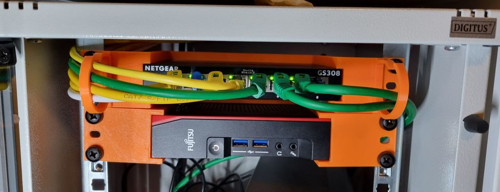 Questa staffa consente di montare uno switch Netgear GS308v3 in un rack da 10 pollici. Dispone di fermacavi integrati su entrambi i lati, garantendo un'installazione ordinata e organizzata dei cavi di rete. Il design assicura un posizionamento stabile e sicuro del tuo switch nell'armadio.