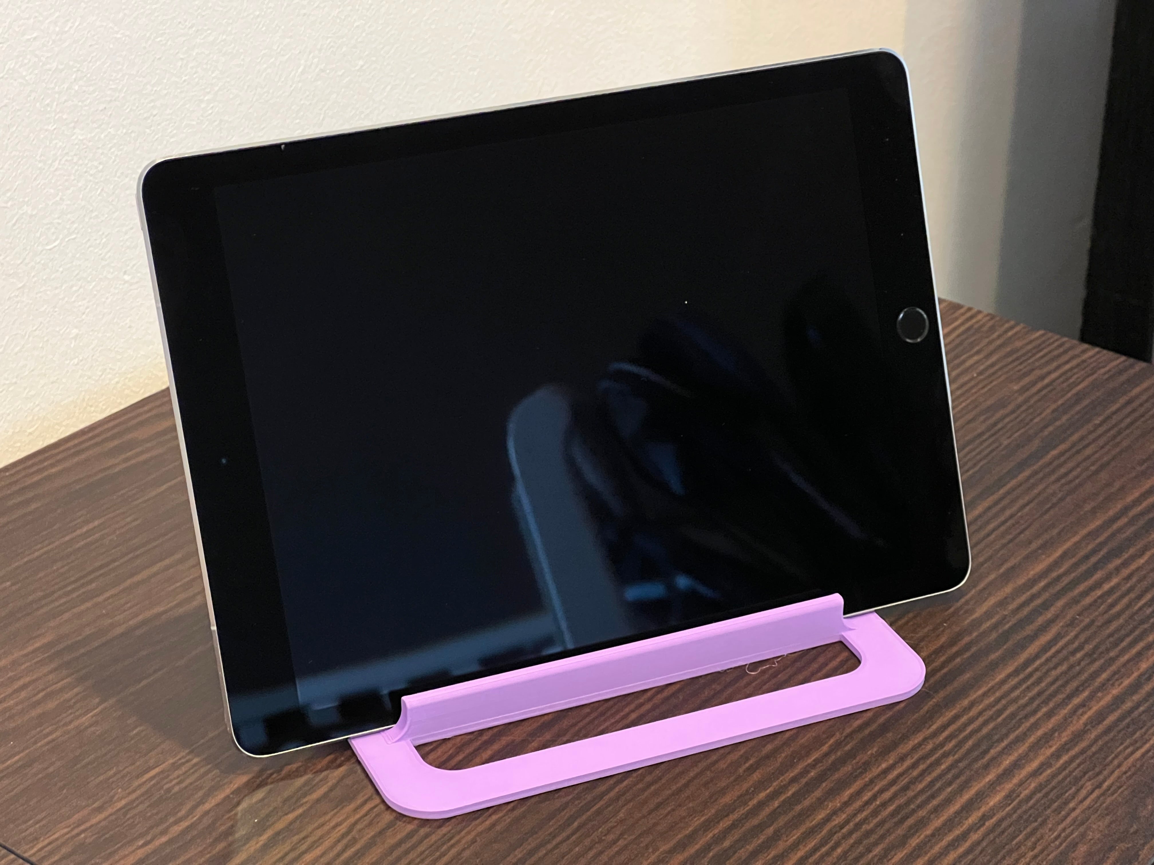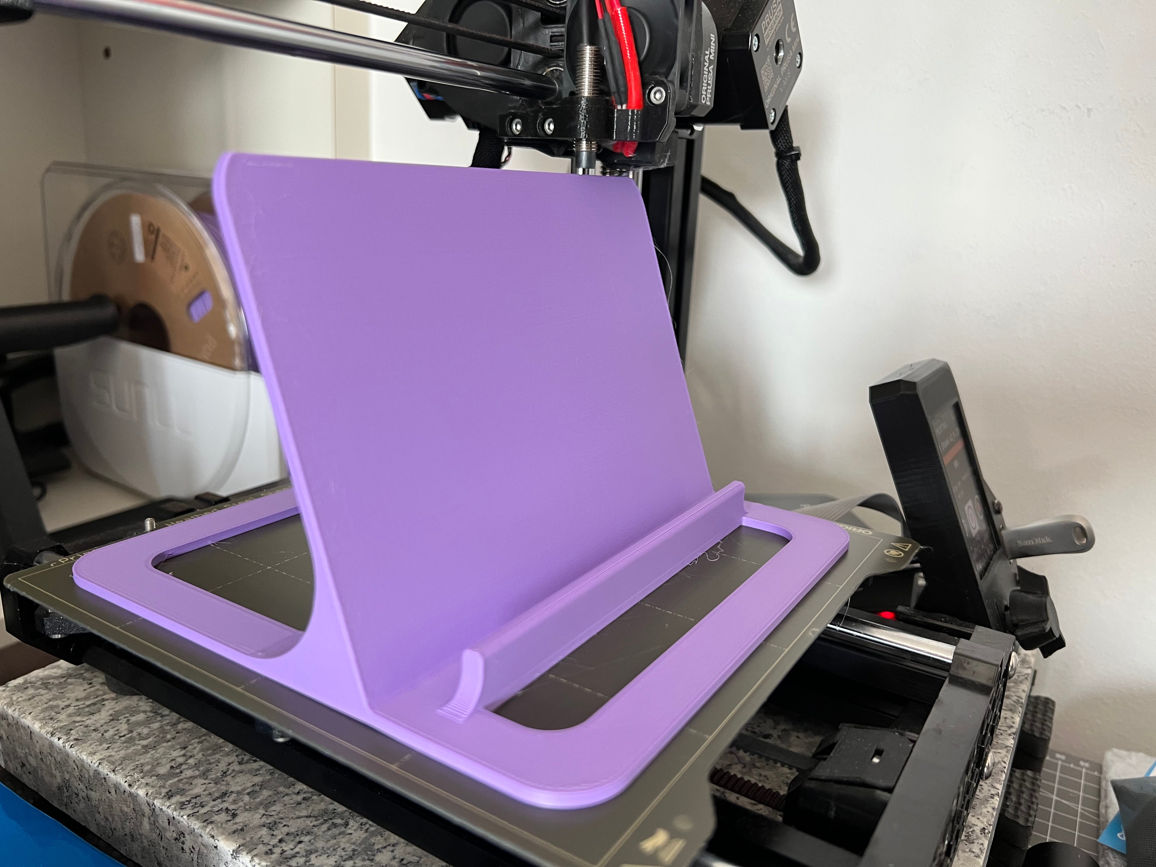 Si tratta di un semplice supporto per iPad, leggermente più grande del solito per garantire la stabilità su superfici più morbide come la biancheria da letto. Si adatta alla maggior parte degli iPad con e senza custodia. Stampato in polimero PolyTerra Purple. Sono inclusi i file Fusion360 e STEP.