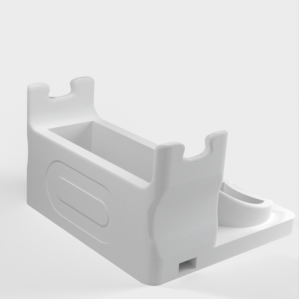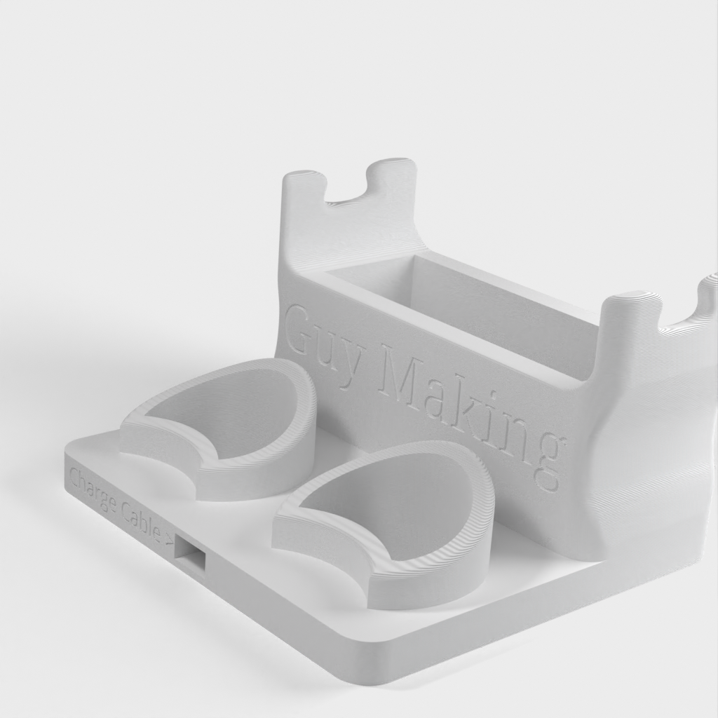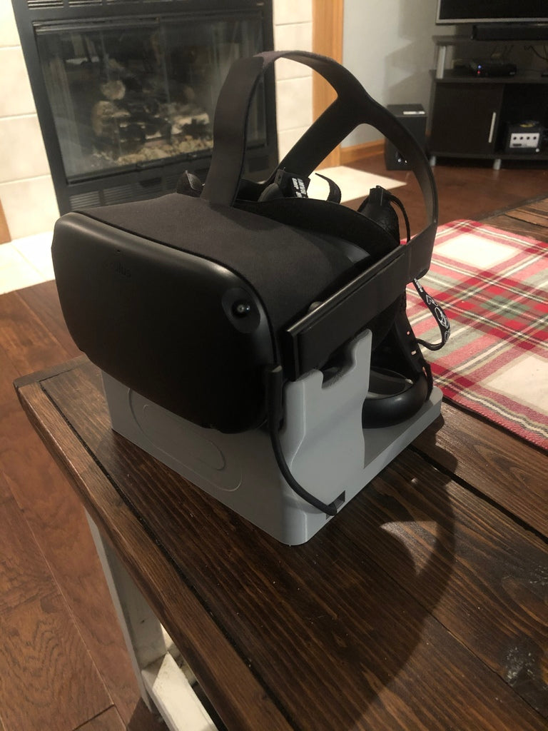 Questo è un supporto per Oculus Quest che fornisce una casa per il tuo headset e i controller. Ha un foro per il cavo di ricarica e un'apertura nella parte superiore per riporre vari accessori.