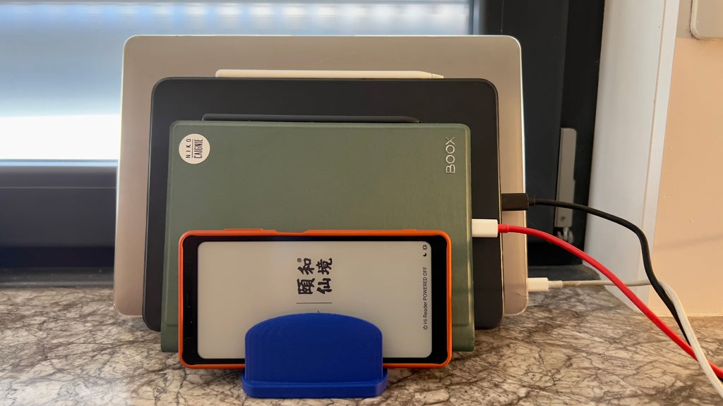 Lo stand è ottimizzato per ospitare un'ampia gamma di dispositivi popolari, tra cui il tuo MacBook (adatto come stand per macbook sia per i modelli Air che Pro), iPad Pro, smartphone e un e-reader come Boox Nova Air 2 o Hisense Compact. Con le sue dimensioni compatte di 9x16 cm, è facile da posizionare su qualsiasi scrivania o comodino.