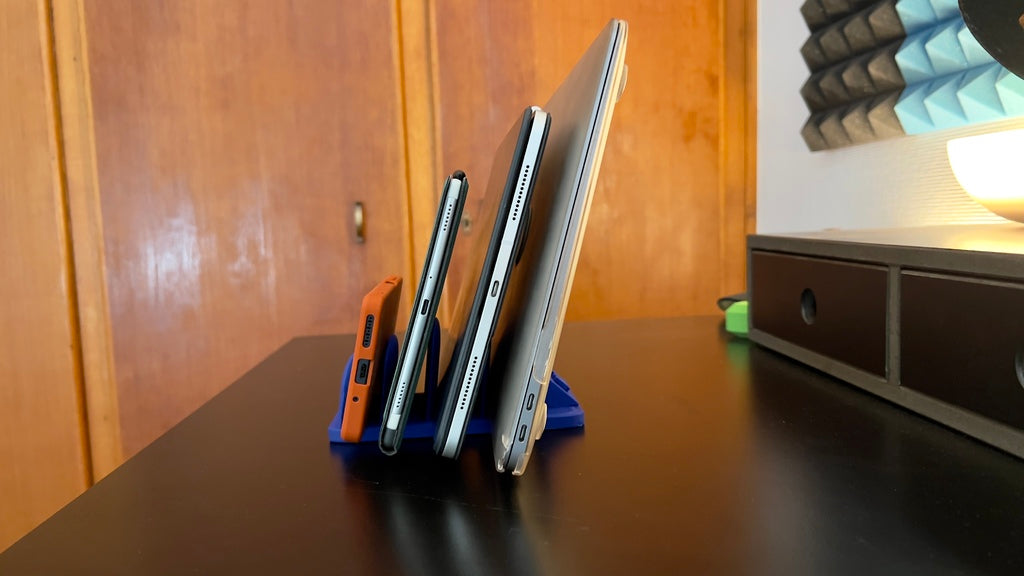 Questo pratico supporto multi-dispositivo è progettato per fornire una soluzione di archiviazione organizzata e salvaspazio per i tuoi dispositivi elettronici. Può ospitare fino a quattro dispositivi contemporaneamente, rendendolo ideale per raccogliere la tua tecnologia in un unico posto.