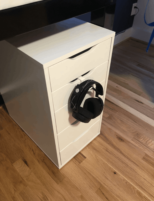 Questo appendiabiti pieghevole per cuffie è una soluzione pratica per mantenere in ordine la scrivania o l'area di lavoro. È progettato per adattarsi perfettamente ai moduli per cassetti Ikea Alex, ma può anche essere facilmente montato su altre superfici con uno spessore fino a 16 mm, come gli scaffali in legno.