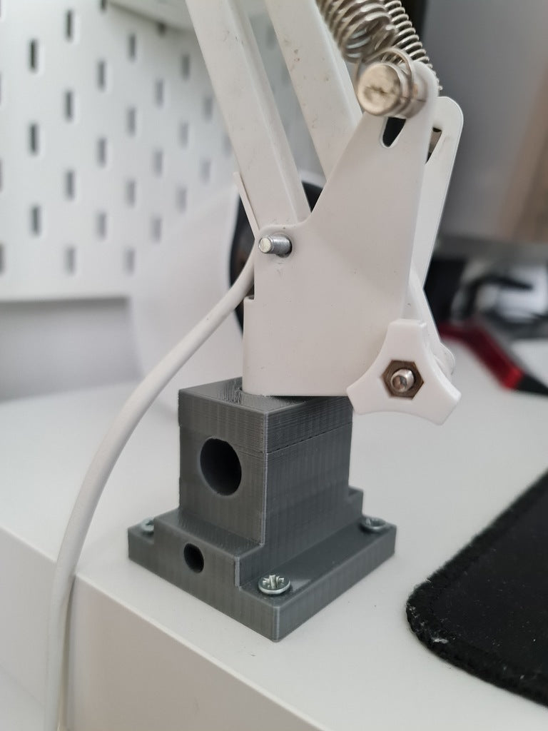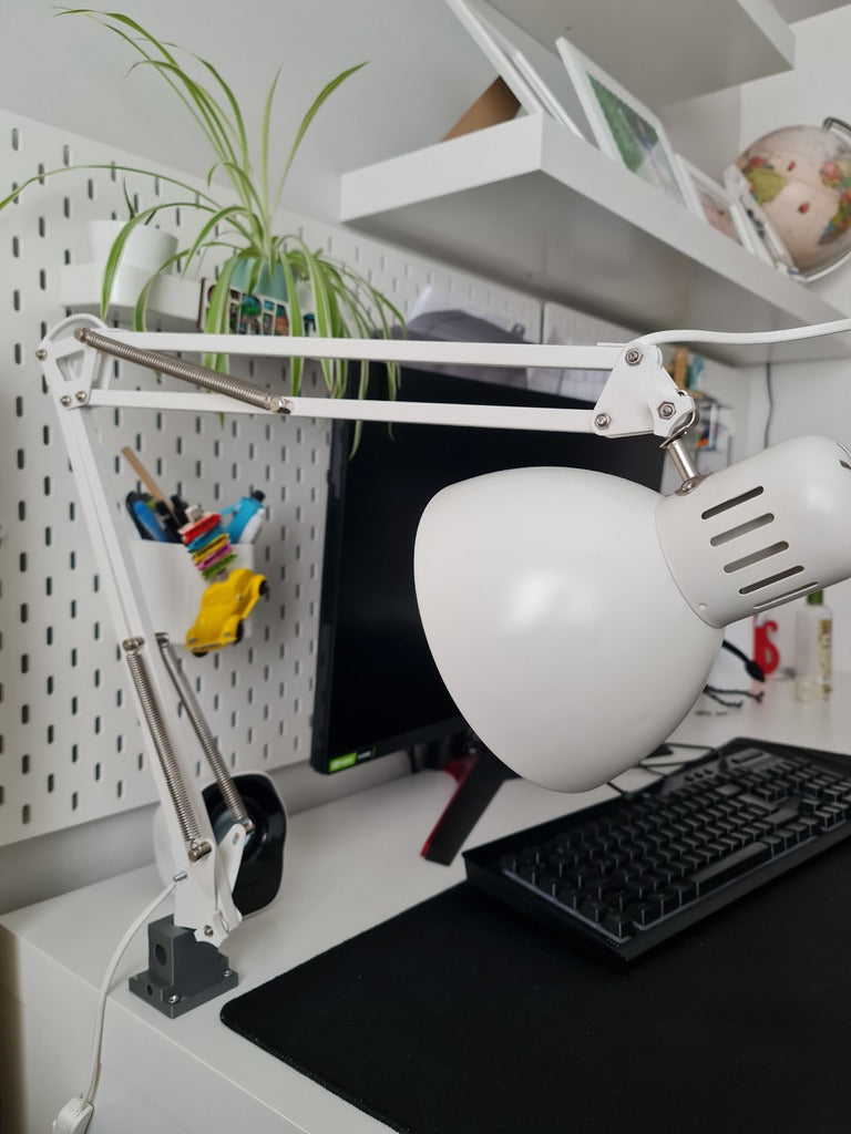 Un supporto da scrivania per la lampada IKEA Tertial. Il supporto può essere fissato direttamente alla scrivania per la massima stabilità e il minimo movimento. Adatto a qualsiasi ufficio o area studio per un'illuminazione ottimale. La lampada Tertial può essere facilmente posizionata nella staffa per uno spazio di lavoro pulito e ordinato.