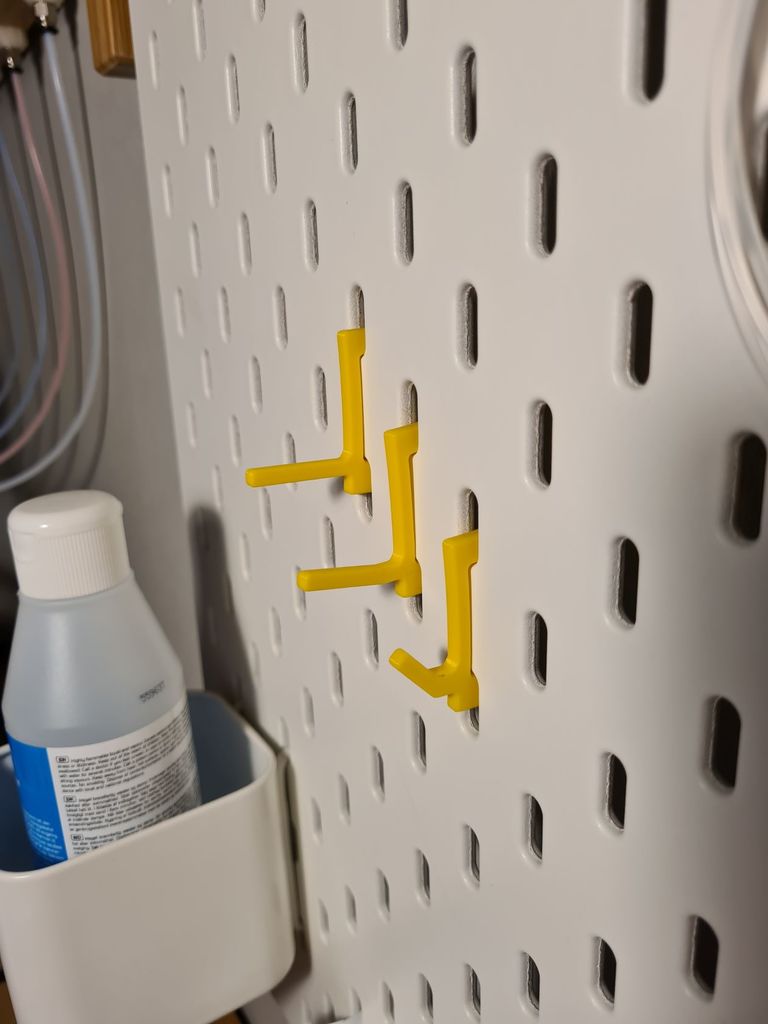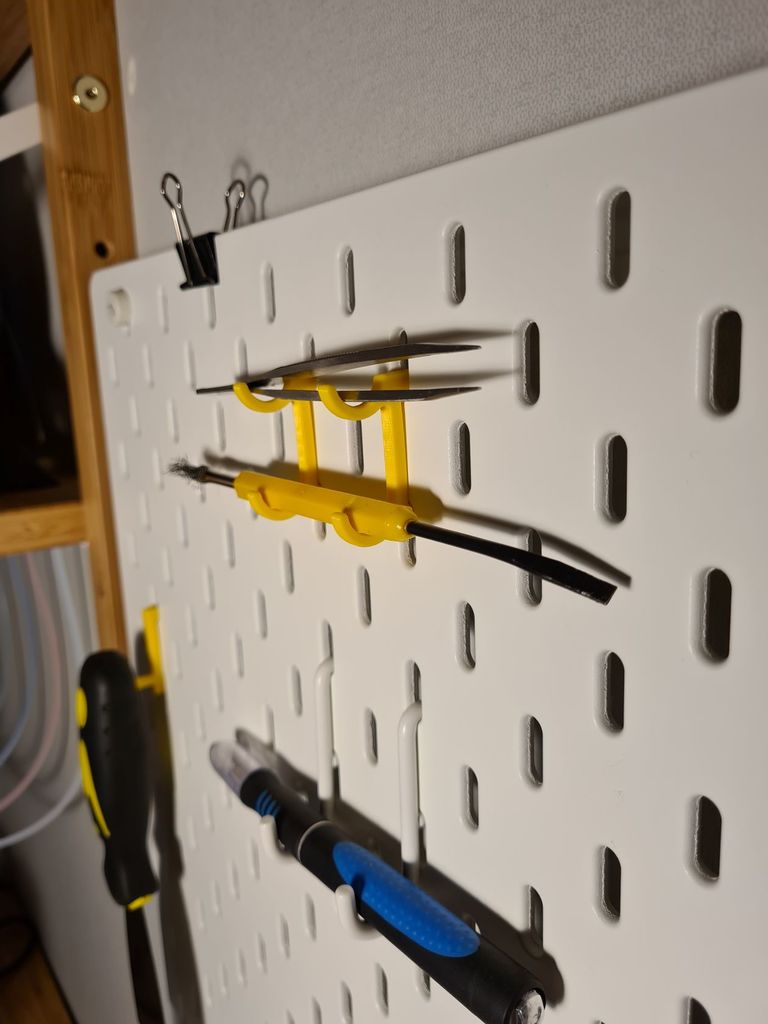 Semplice gancio e doppio portapenne progettato per la bacheca IKEA Skådis. Il prodotto è molto robusto e può essere facilmente montato direttamente sulla piastra, rendendo più facile tenere traccia delle penne e di altri piccoli oggetti direttamente sul posto di lavoro.