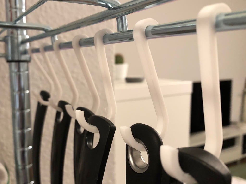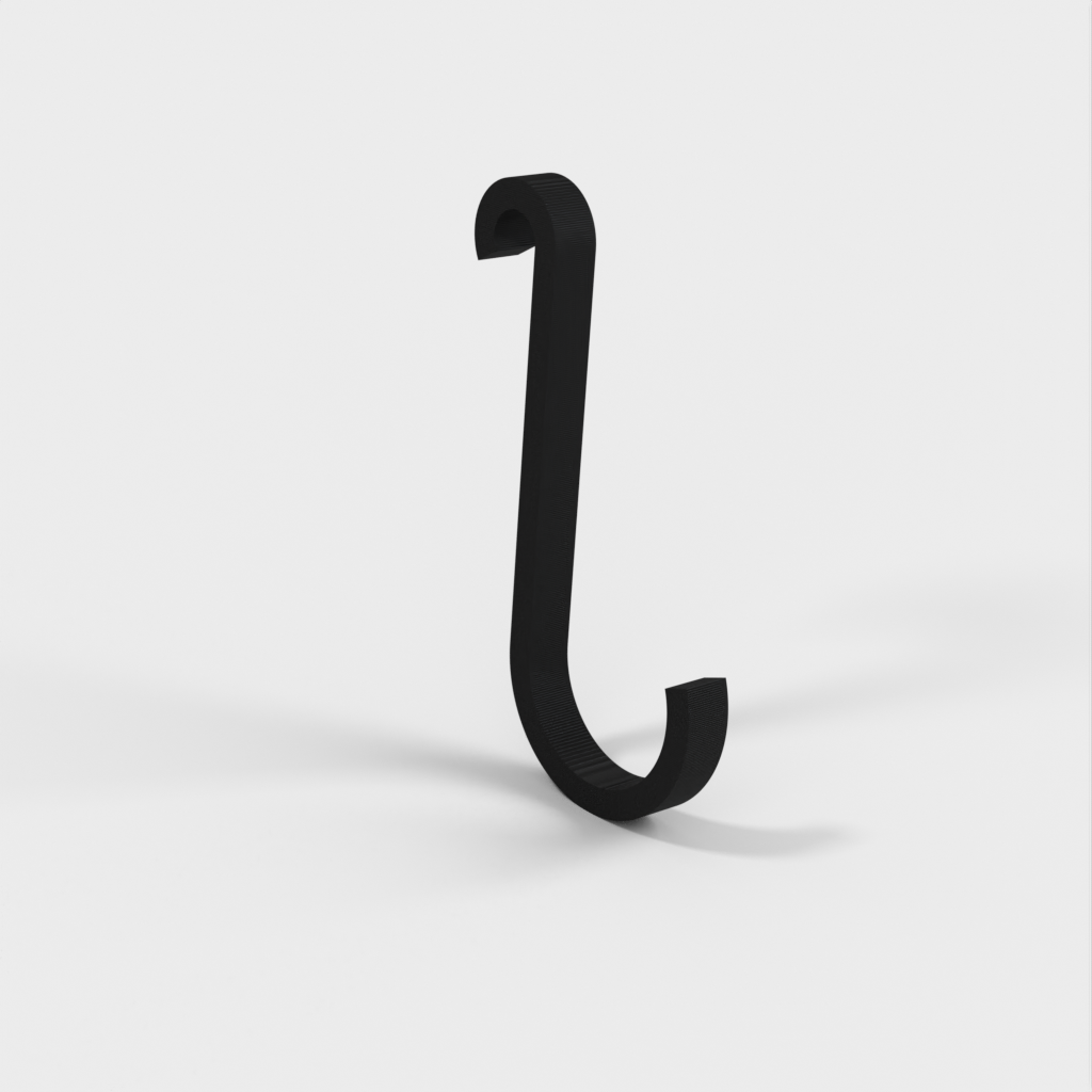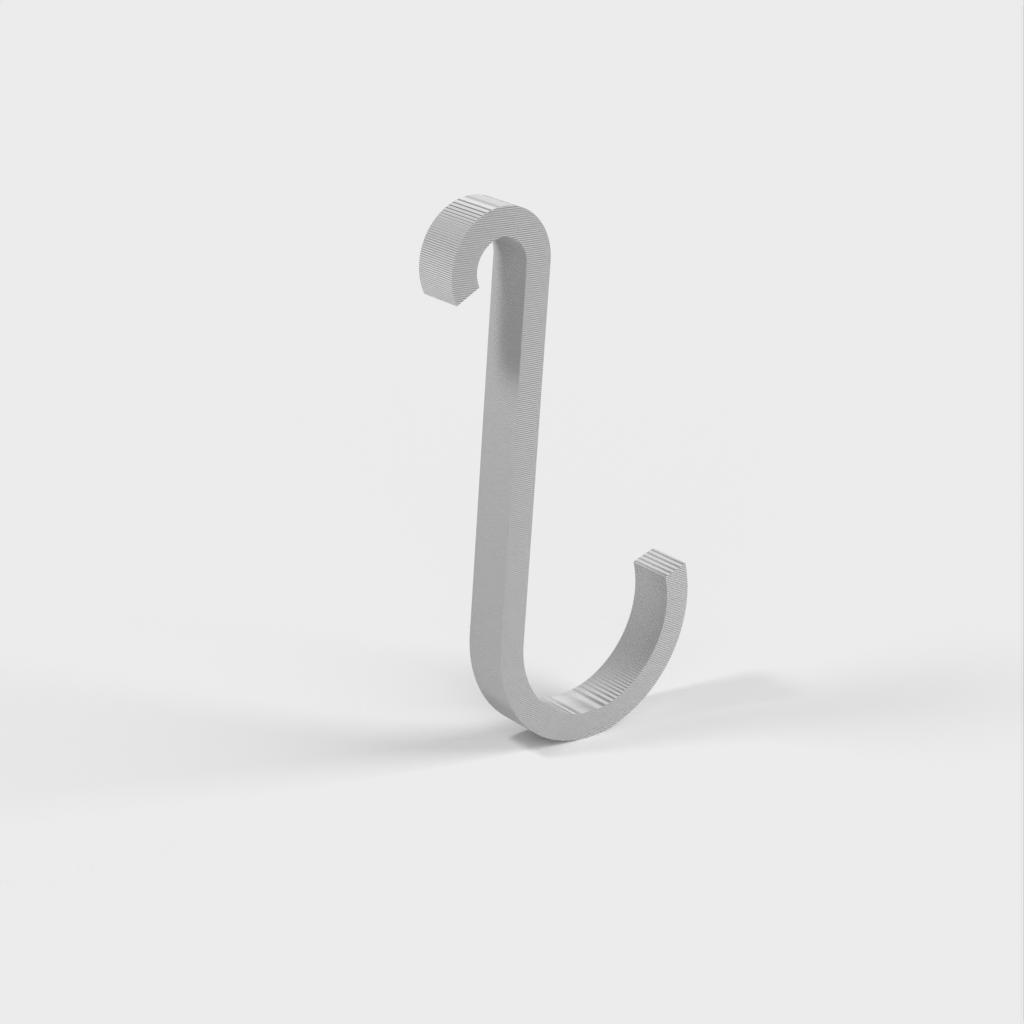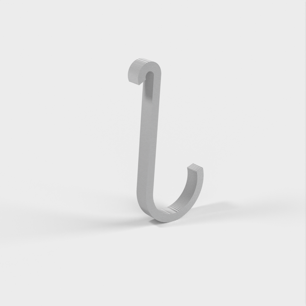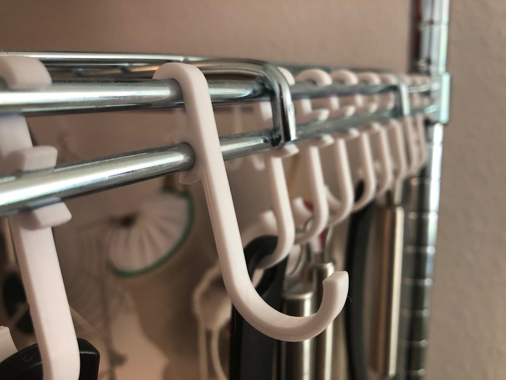 Un gancio regolabile che si adatta perfettamente alle barre dello scaffale IKEA Omar. Lo usiamo per appendere gli utensili da cucina. Il gancio si adatta perfettamente, in modo da non cadere o muoversi troppo quando si appendono o si prendono gli oggetti.