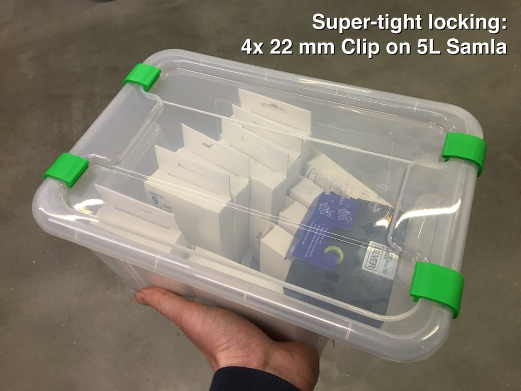 Questa è una clip auto-prodotta per le famose scatole Samla di IKEA. Realizzata con resistenza e durata come priorità principale, questa clip soddisfa tutte le tue esigenze di stoccaggio, sia per scatole da 5, 11, 22, 45 o 65 litri. Perfetta per chi ha bisogno di una soluzione di serraggio più efficiente per le proprie scatole Samla.