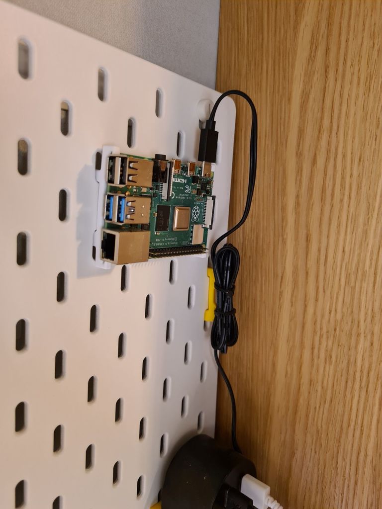 Supporto per Raspberry Pi 4 e clip per cavi per la bacheca IKEA Skådis. Il supporto può essere montato direttamente sulla parete con 4 viti o su una bacheca IKEA Skådis. Il Raspberry Pi 4 può essere facilmente posizionato nel supporto, rendendo il vostro spazio di lavoro più ordinato.