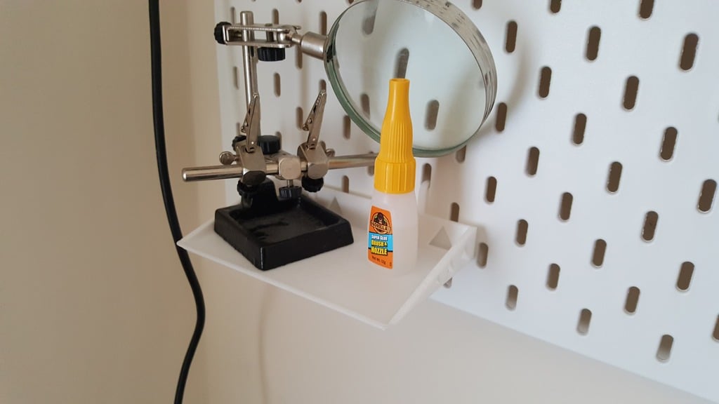 Una confezione di ripiani e ganci per il sistema di lavagne a pioli IKEA SKÅDIS. I ganci possono essere rimossi, ma si consiglia di incollarli per una maggiore sicurezza. Con questa confezione è possibile organizzare e riporre facilmente i propri oggetti in modo efficiente e sicuro.