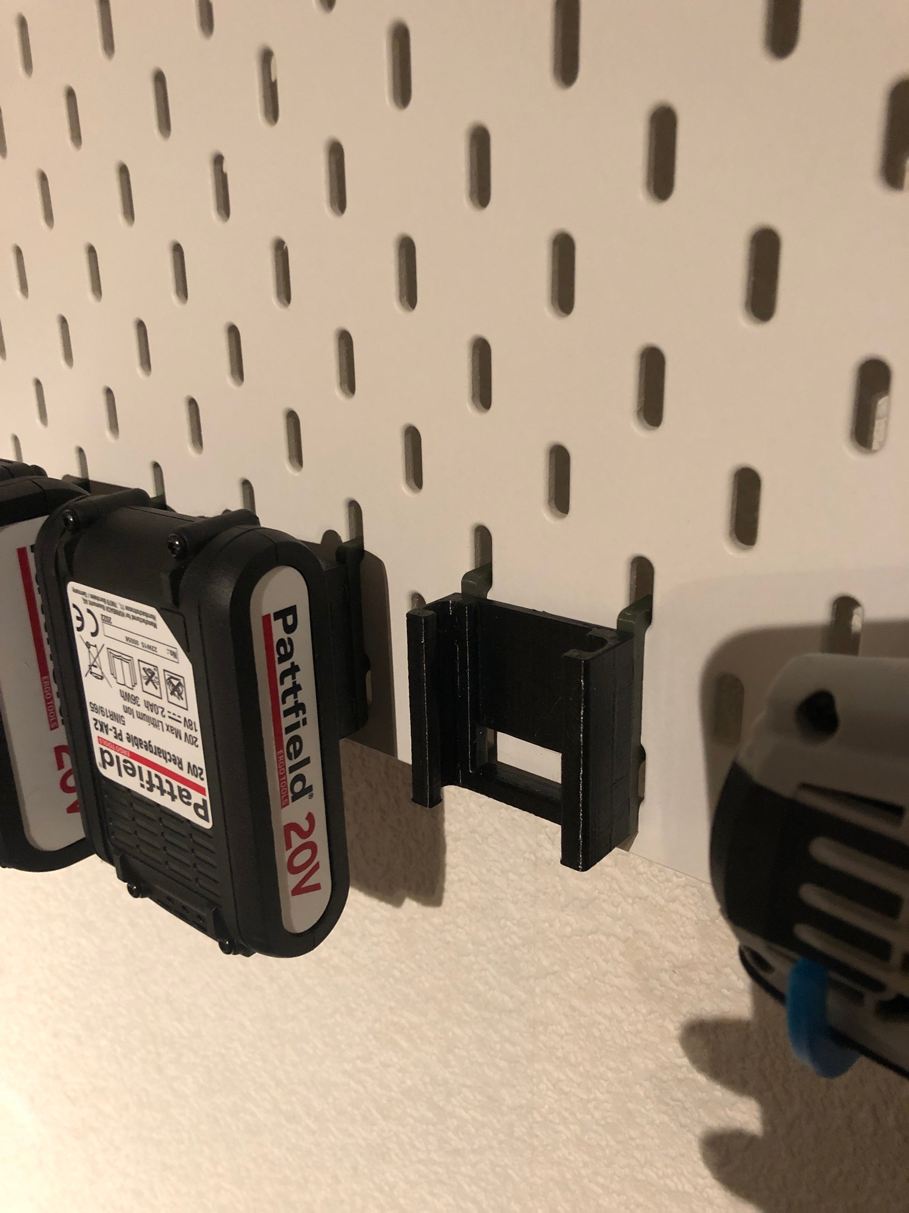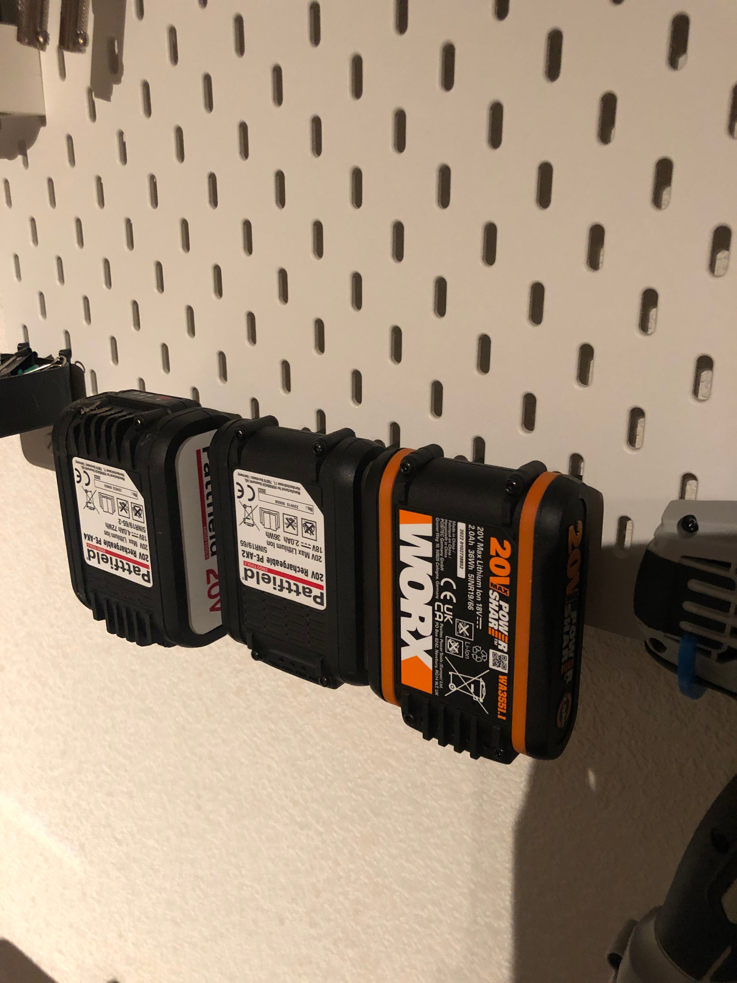 Questo supporto 2 in 1 è progettato per montare in modo sicuro le tue batterie Worx o Pattfield da 20 V sul tuo sistema IKEA Skadis. Fornisce una pratica soluzione di archiviazione che mantiene le batterie organizzate e facilmente accessibili nel tuo laboratorio, garage o stanza degli hobby. Il montaggio è robusto, grazie alla perfetta aderenza con i ganci universali (dal set di CSD_Salzburg), assicurando che le batterie rimangano in posizione.