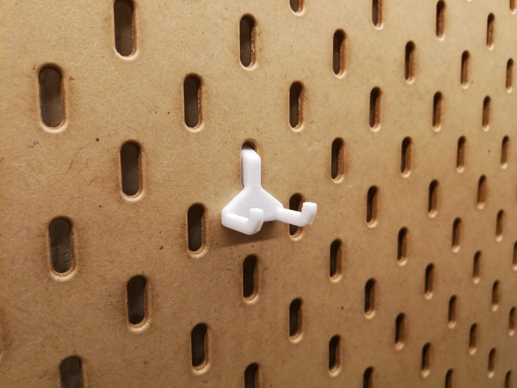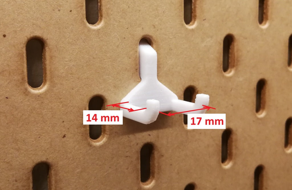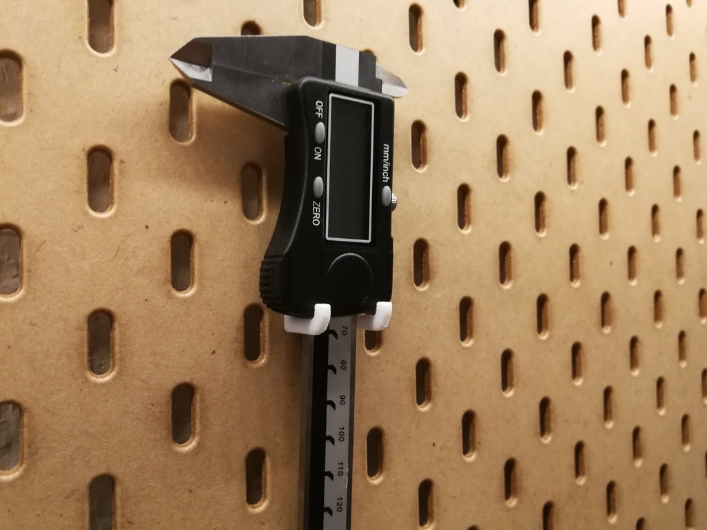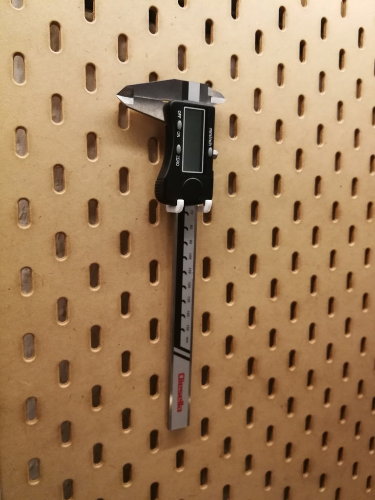 Portacalibri per IKEA Skådis. Questo supporto è stato progettato per riporre un calibro su una bacheca IKEA Skådis. Il supporto misura 17 mm tra i due ganci ed è profondo 14 mm, come mostrato in una delle immagini.