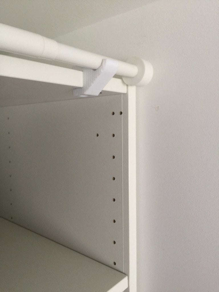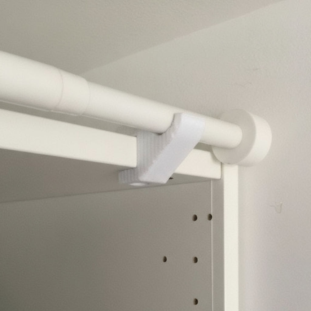 Questo è un supporto per bastone per tende senza necessità di forare. È progettato per adattarsi allo spessore di un armadio IKEA e consente di montare facilmente il bastone per tende senza l'uso di viti. È adatto per armadi con uno spessore di 18 mm.