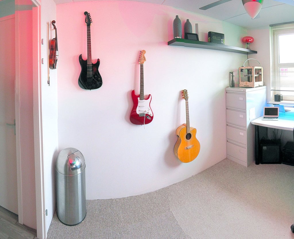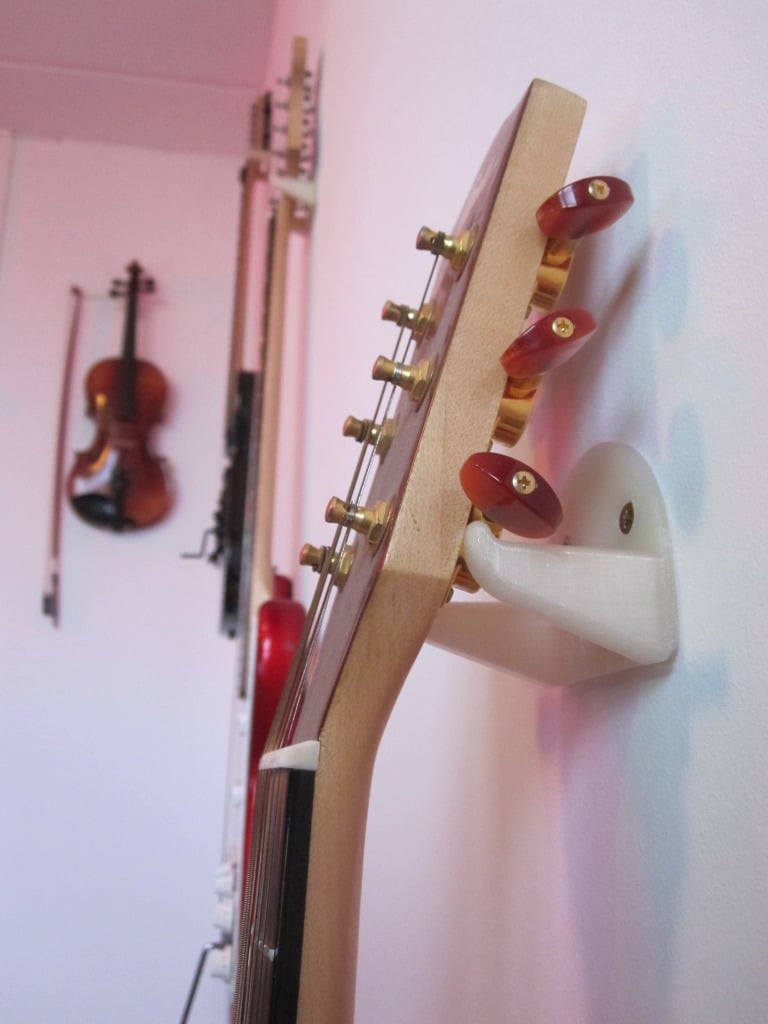 Questo è un supporto da parete per appendere una chitarra. Può contenere una Squier Showmaster, che pesa circa 4 kg. Il prodotto è stato aggiornato più volte per migliorarne il design e la compatibilità. L'ultimo aggiornamento include una staffa più piccola con fori per le viti tra i bracci.