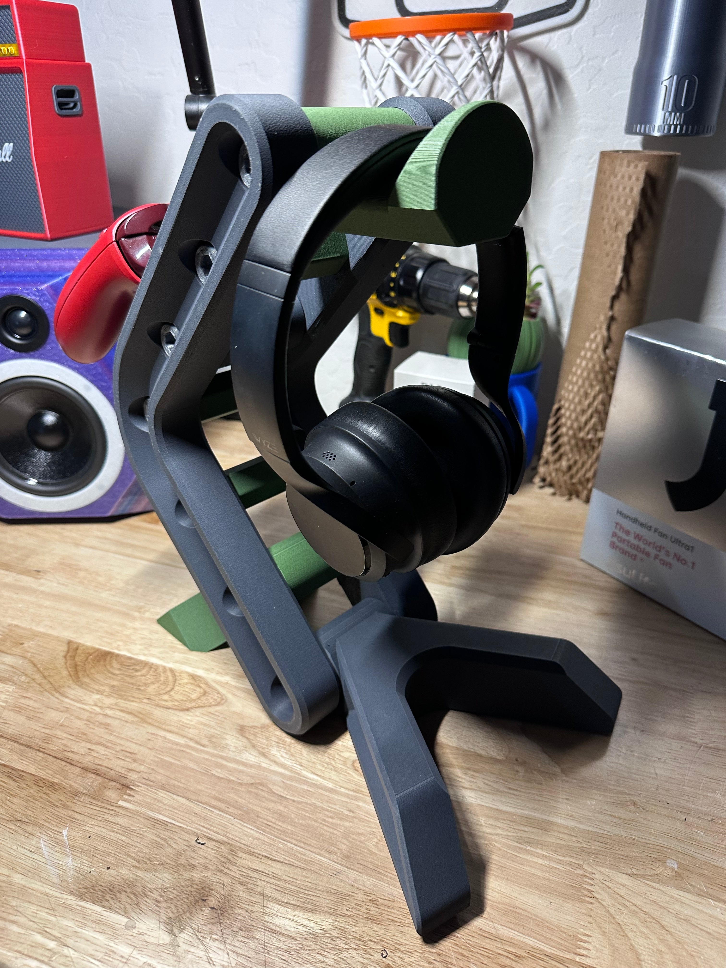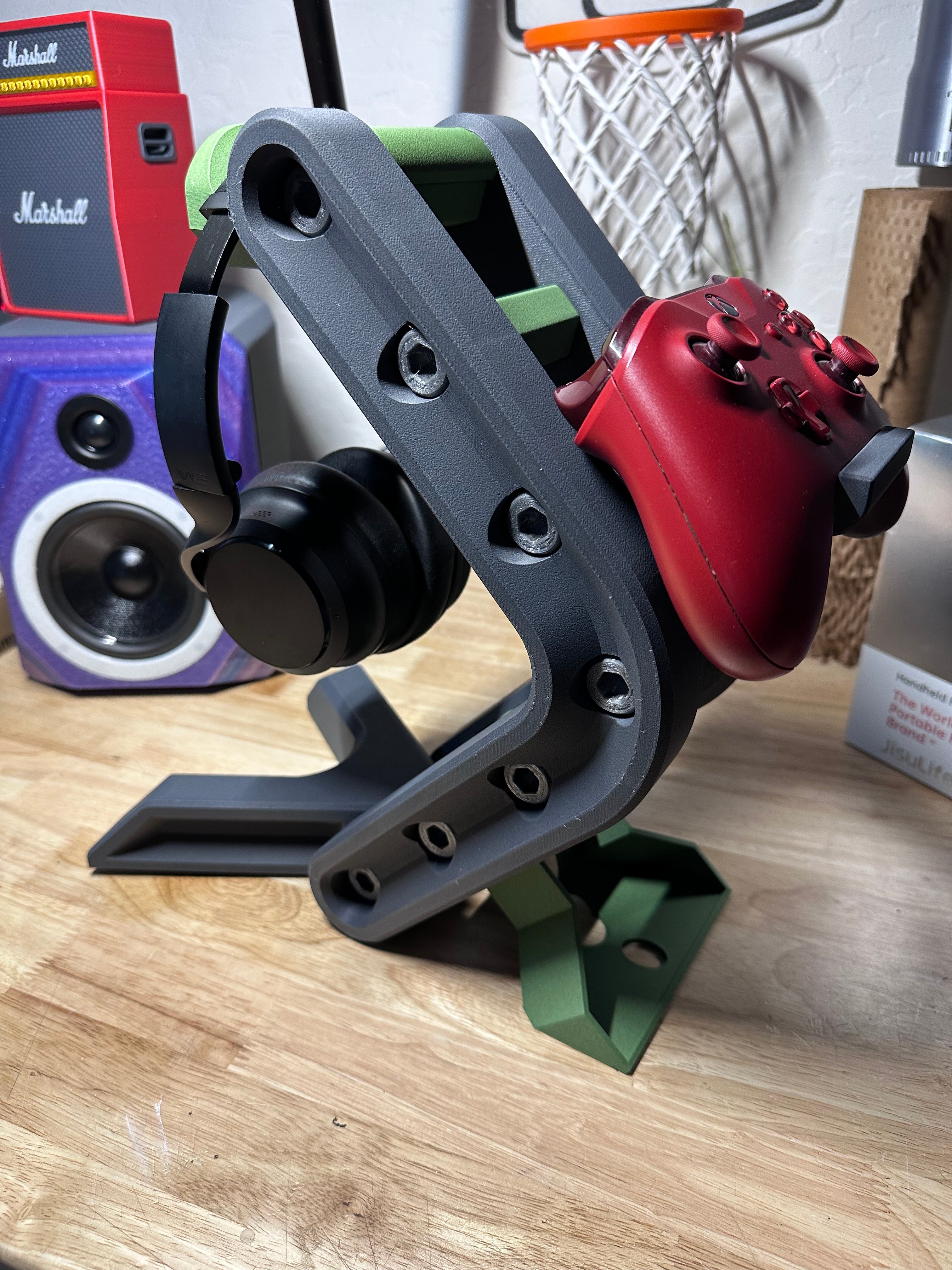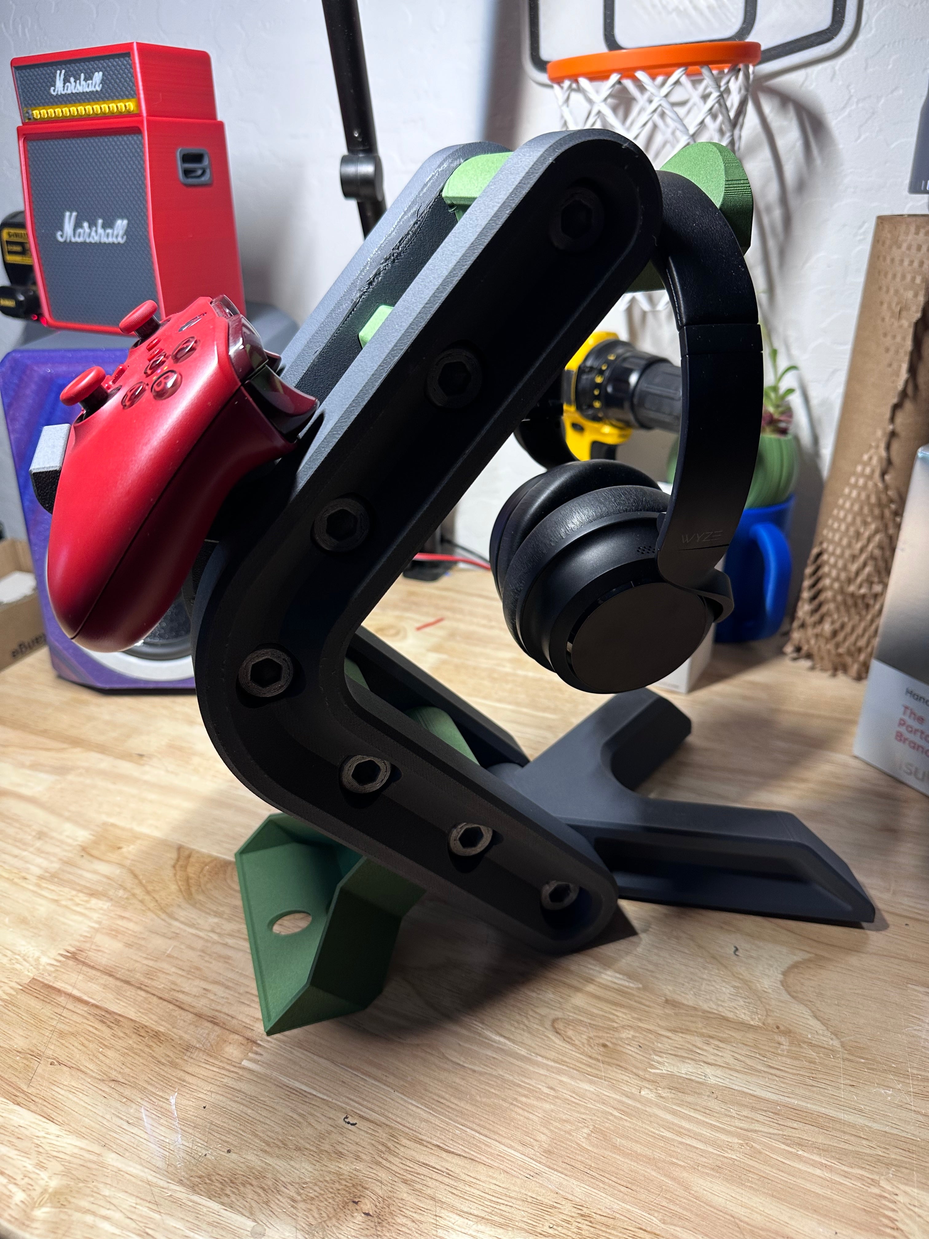 Il supporto per cuffie è progettato per ospitare più cuffie, in modo da poter appendere facilmente l'intera collezione. Inoltre, il design include un pratico supporto per controller, che può essere ampliato aggiungendo più dispositivi secondo necessità. Questo lo rende una soluzione versatile, adattabile alla tua configurazione specifica e in grado di mantenere la tua area ordinata.