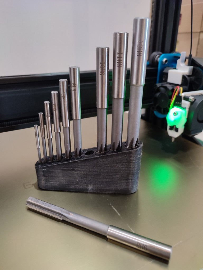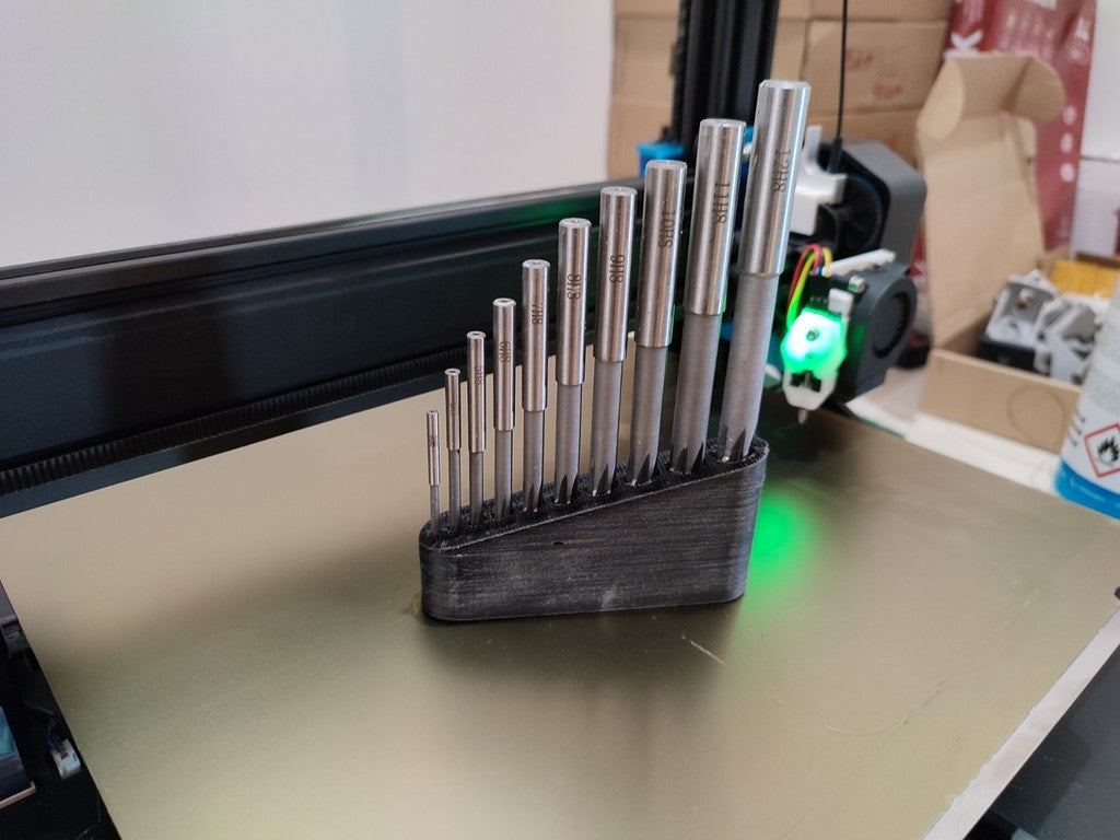 - Mantiene le punte e gli alesatori nelle misure 3, 4, 5, 6, 7, 8, 9, 10, 11 e 12 mm organizzati.