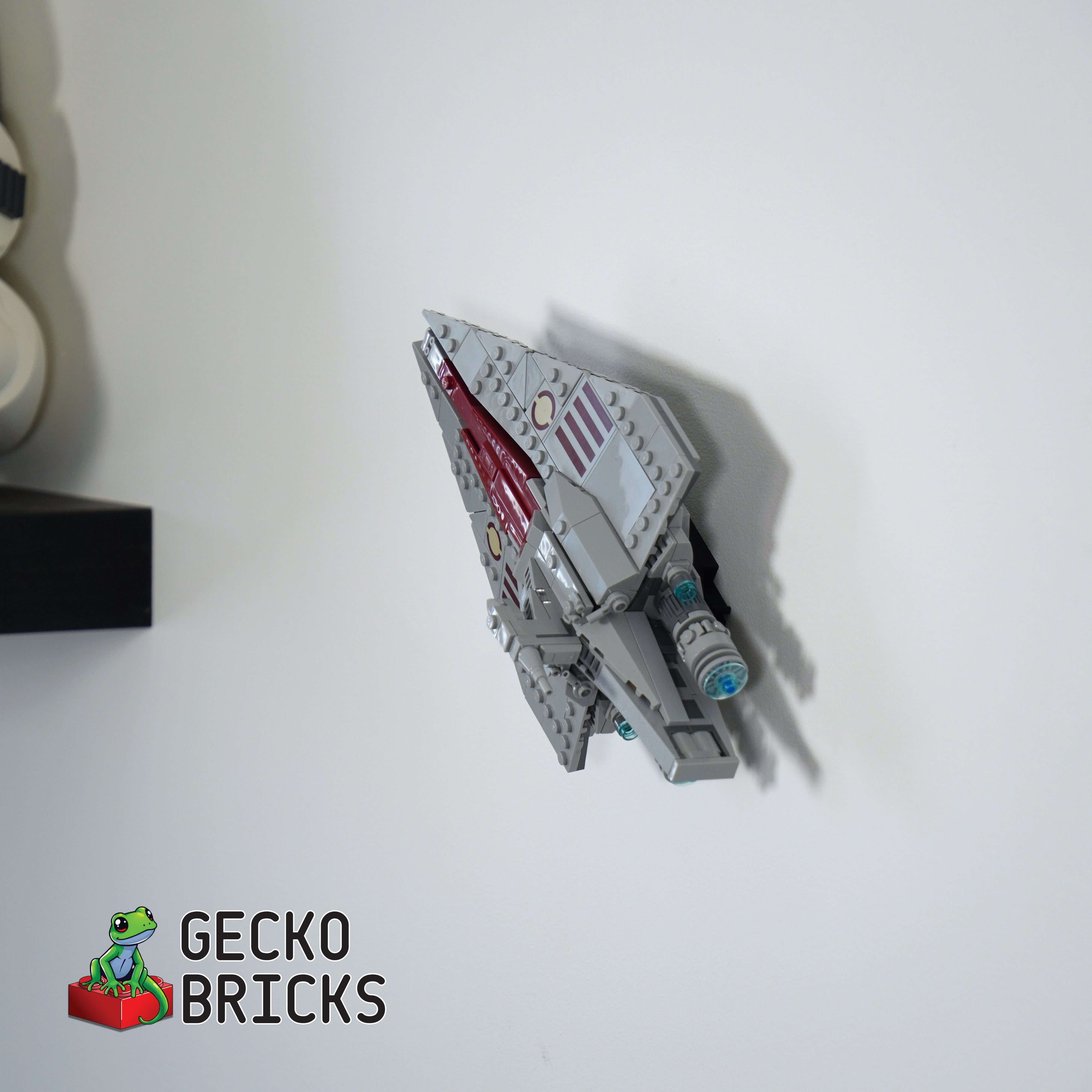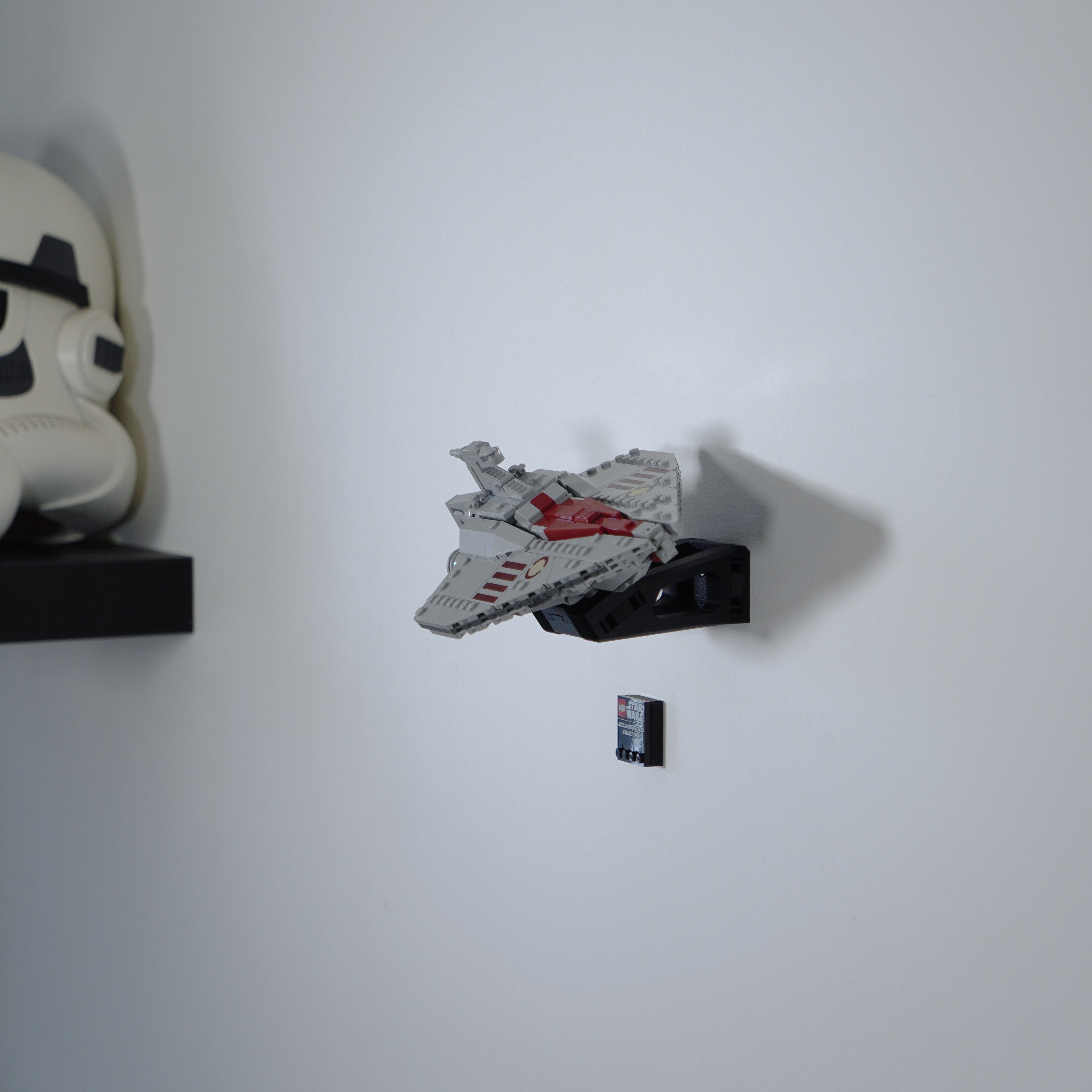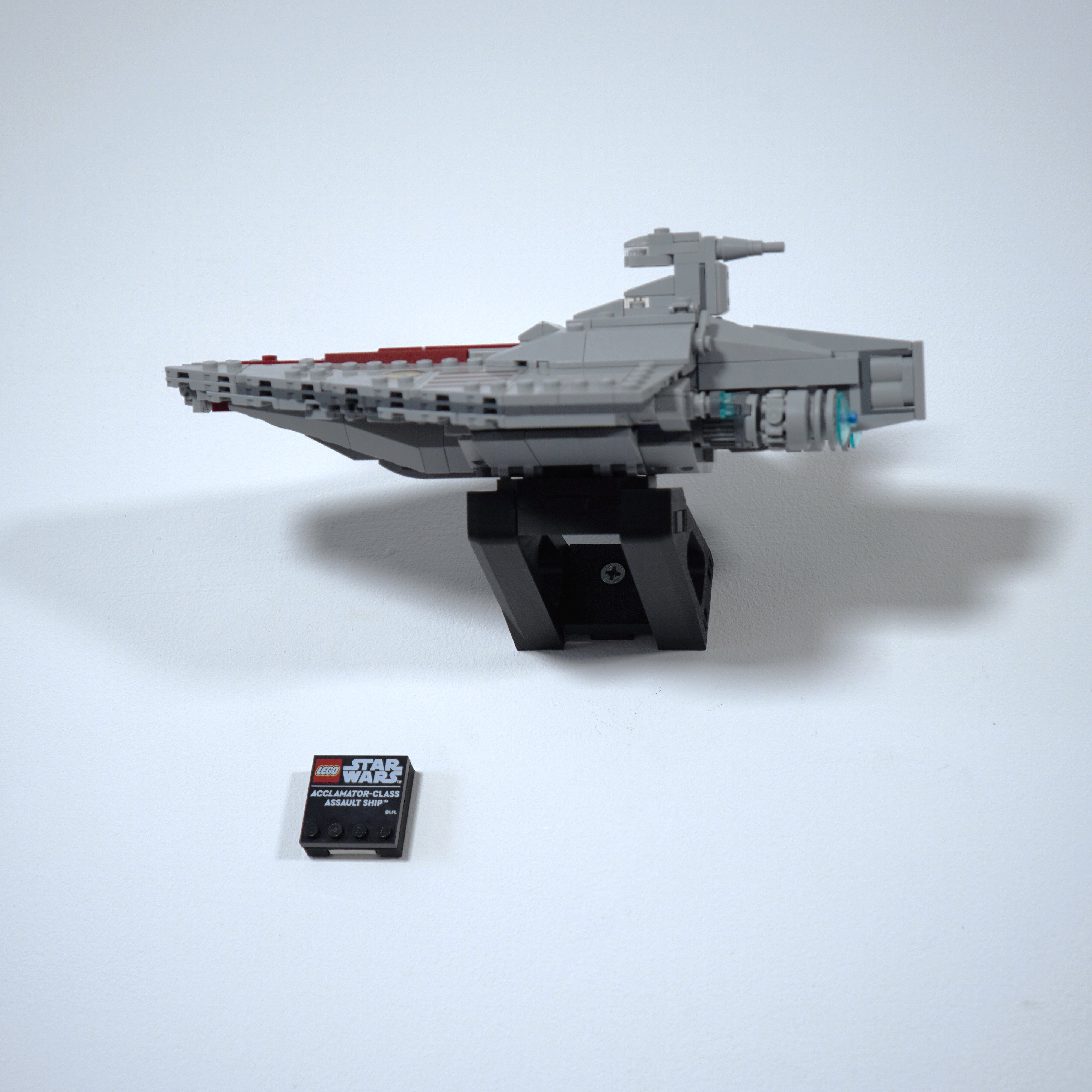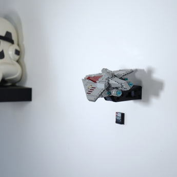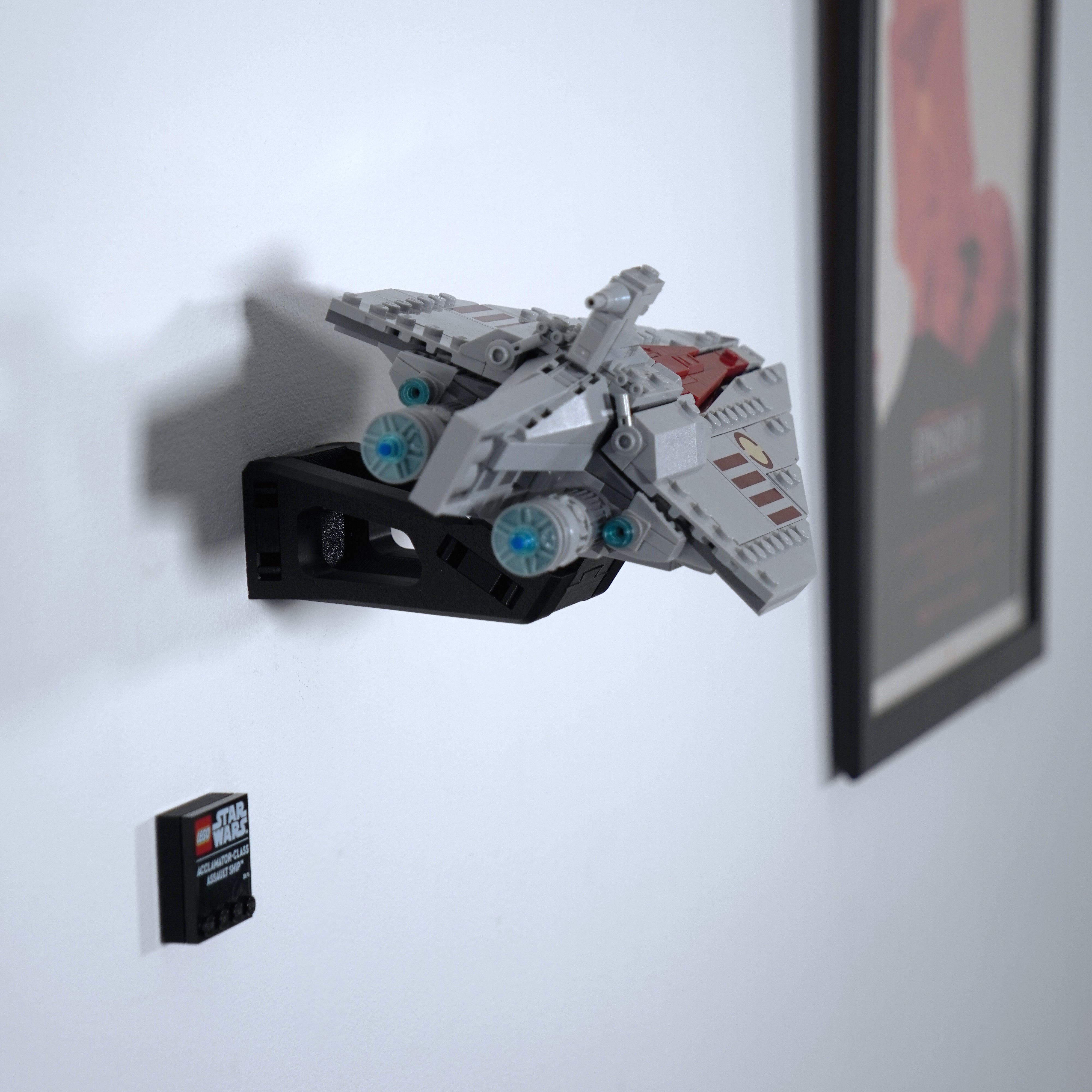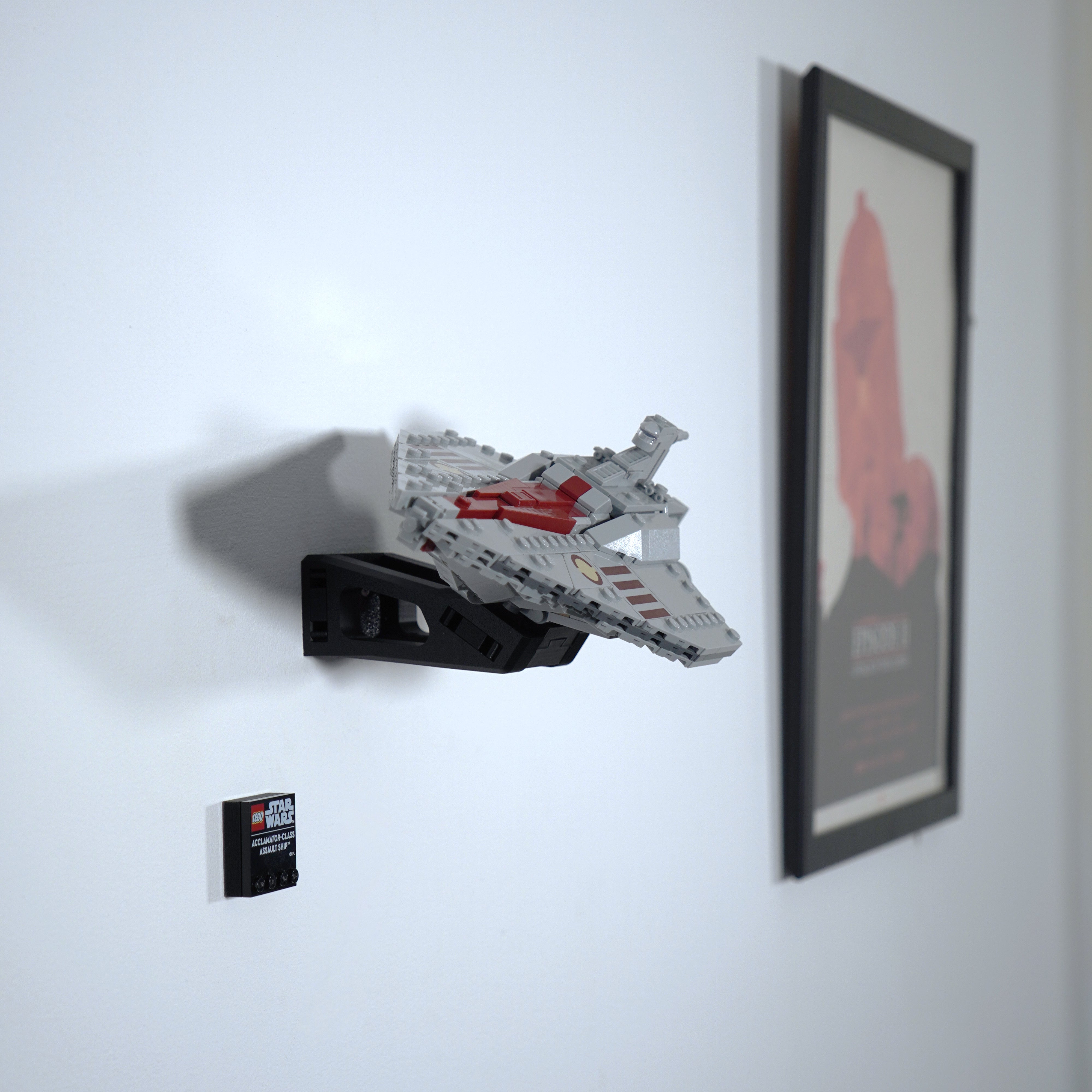 Dette vægbeslag lader dig fremvise dit Star Wars Acclamator sæt på en sikker og elegant måde. Vælg mellem plan montering eller vinklede positioner for at tilpasse udstillingen til dit rum. Designet sikrer, at modellen nemt kan tages ned igen, og sættet inkluderer en holder til navnepladen.