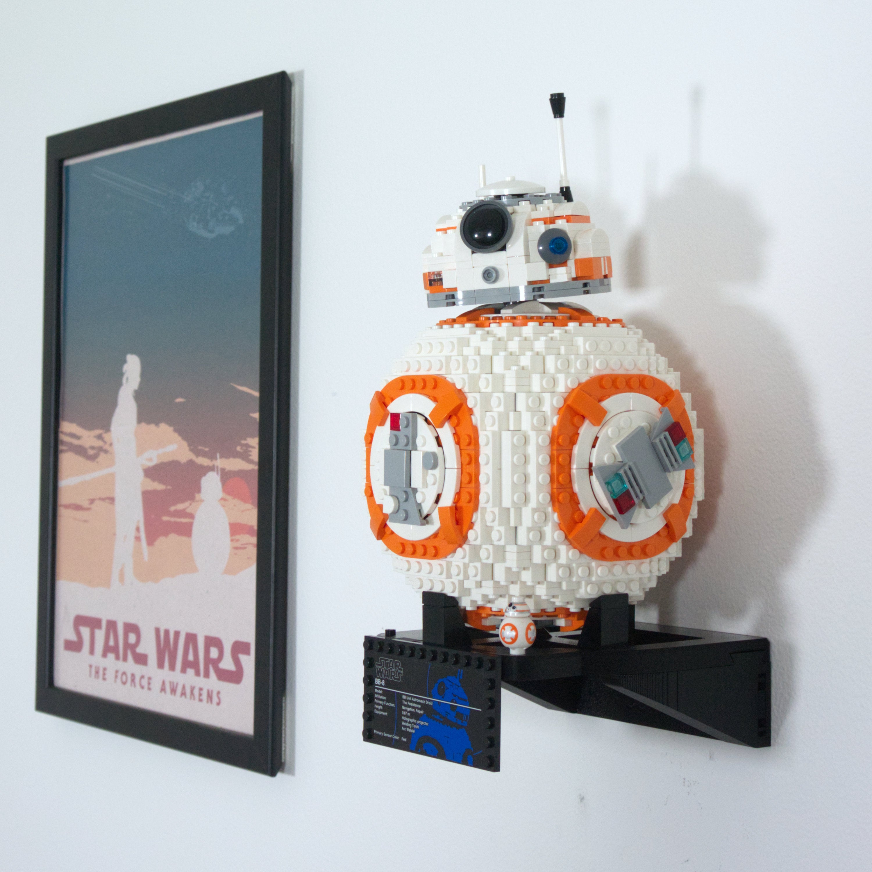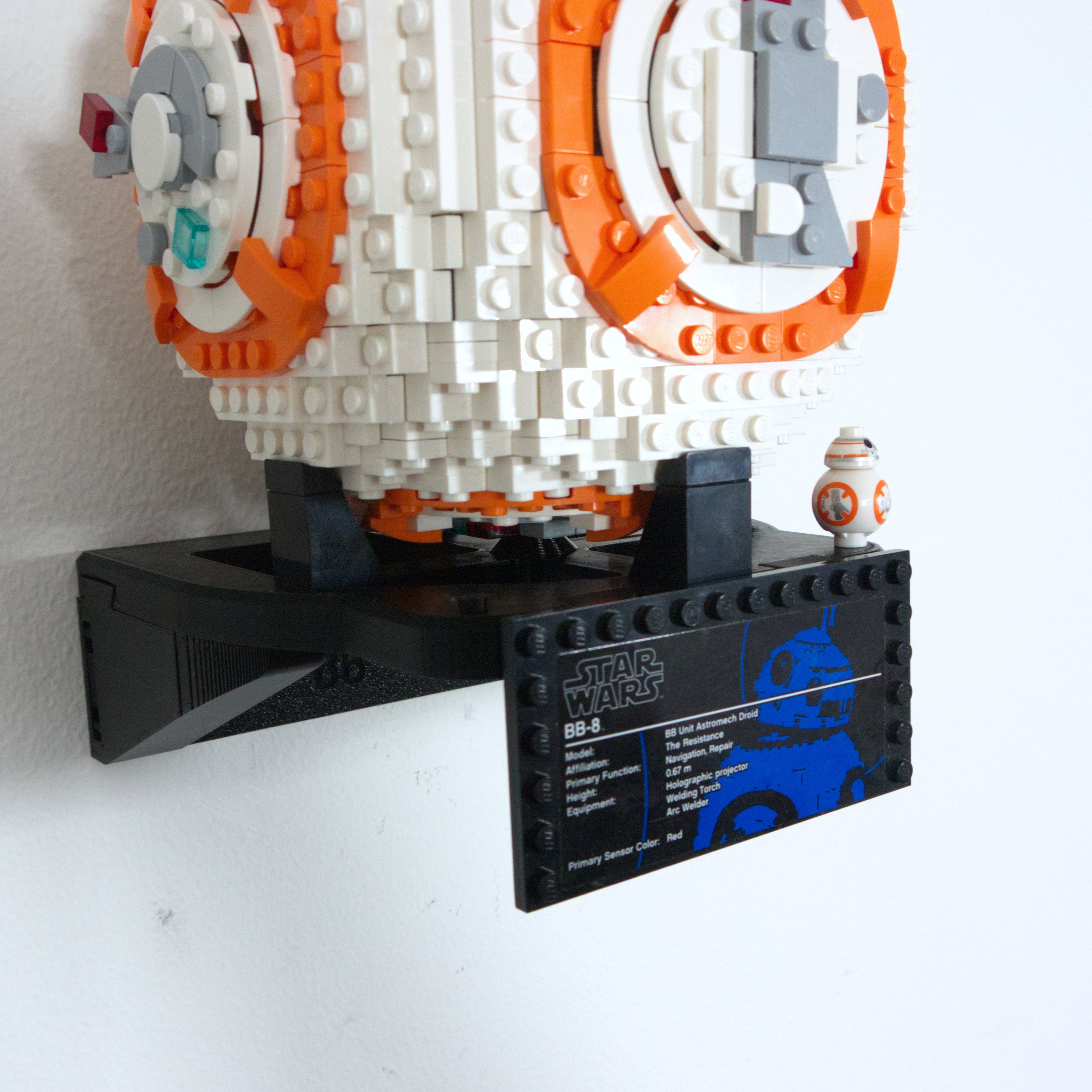 Dette vægophæng er designet specifikt til Star Wars BB-8 75187 sættet. Det muliggør nem ophængning og aftagning af modellen ved hjælp af en enkelt skrue. Beslaget har desuden en integreret holder til både informationskortet og den tilhørende minifigur for en komplet præsentation.