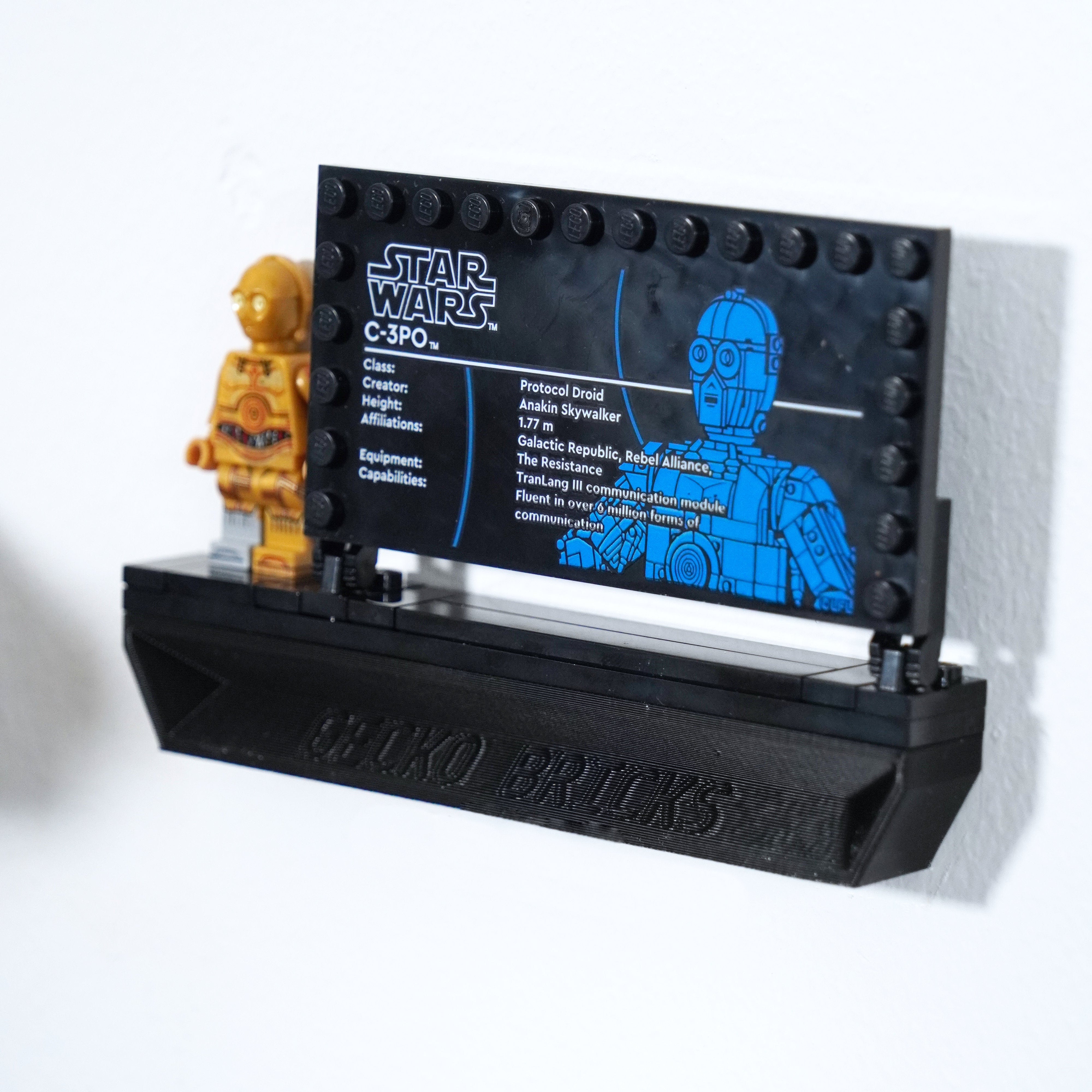 Dette vægophæng er designet specifikt til LEGO Star Wars C-3PO sættet (75398). Beslaget gør det muligt at udstille modellen vendt fremad eller til siderne, mens den nemt kan tages ned igen. Sættet inkluderer også en holder til informationspladen og minifiguren for en komplet præsentation på væggen.