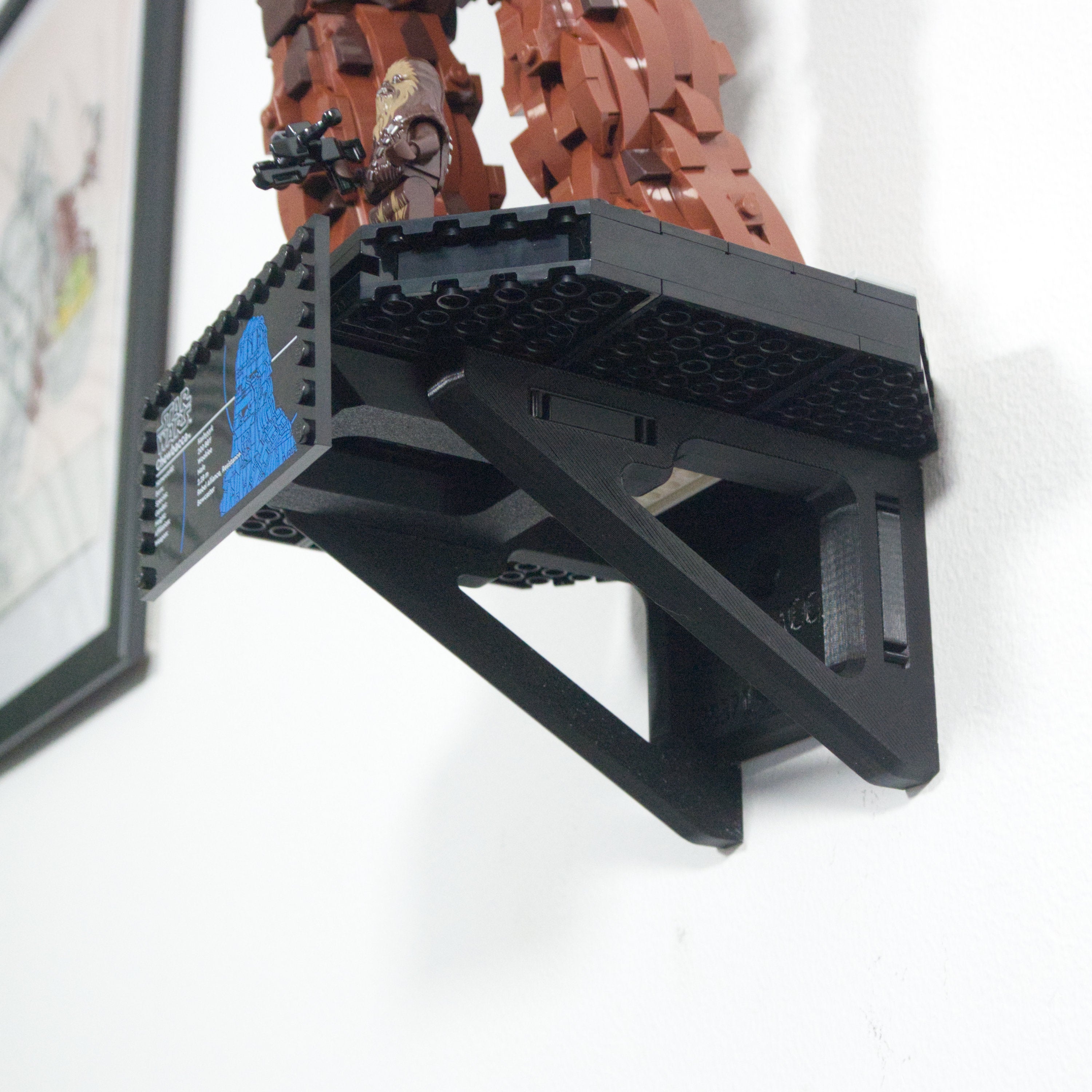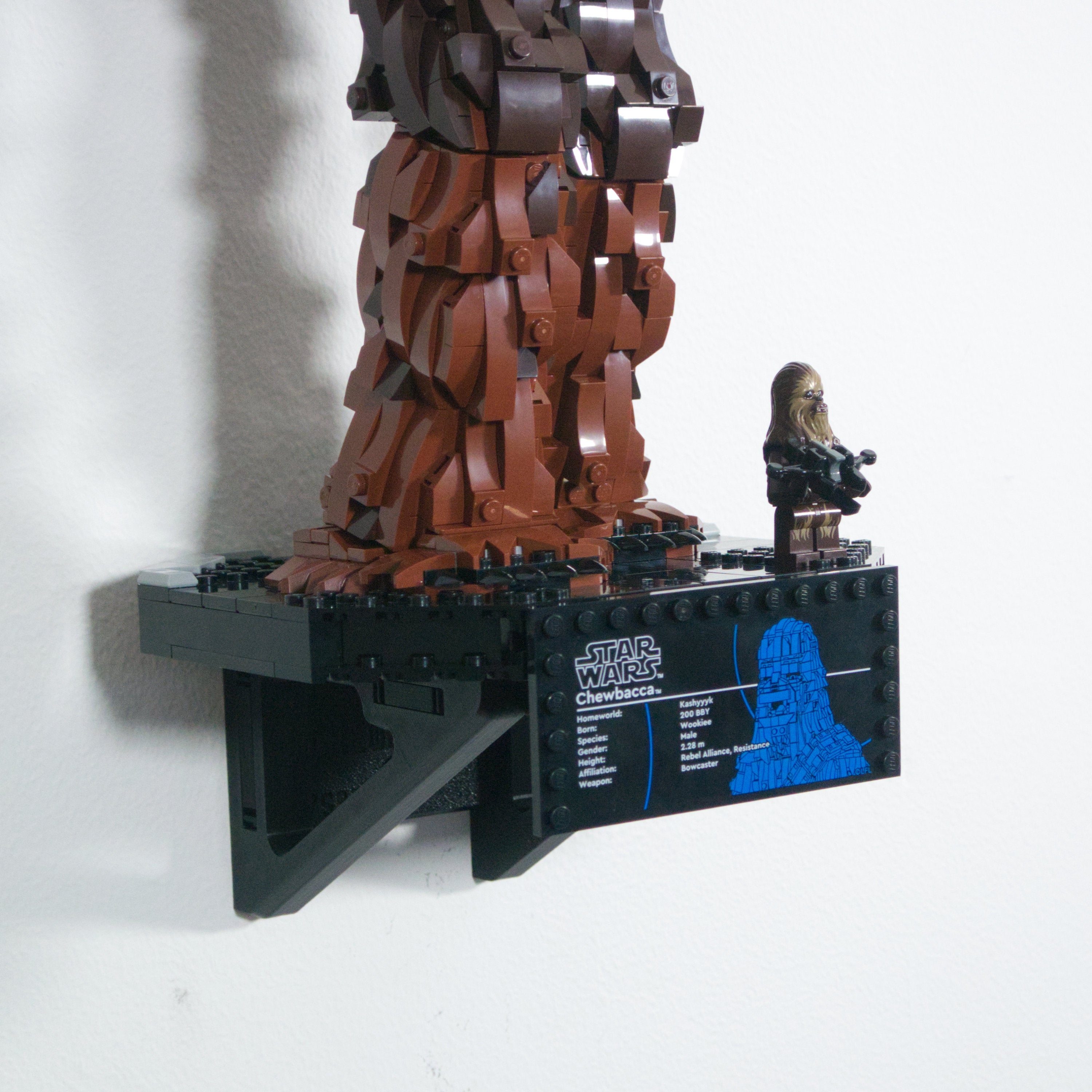 Mostra il tuo LEGO Star Wars Chewbacca con questo supporto da parete funzionale. La staffa si monta saldamente con due viti e rende facile rimuovere il modello quando necessario. È inclusa anche una base dedicata sia per la targa informativa che per la minifigure per un'esposizione completa.
