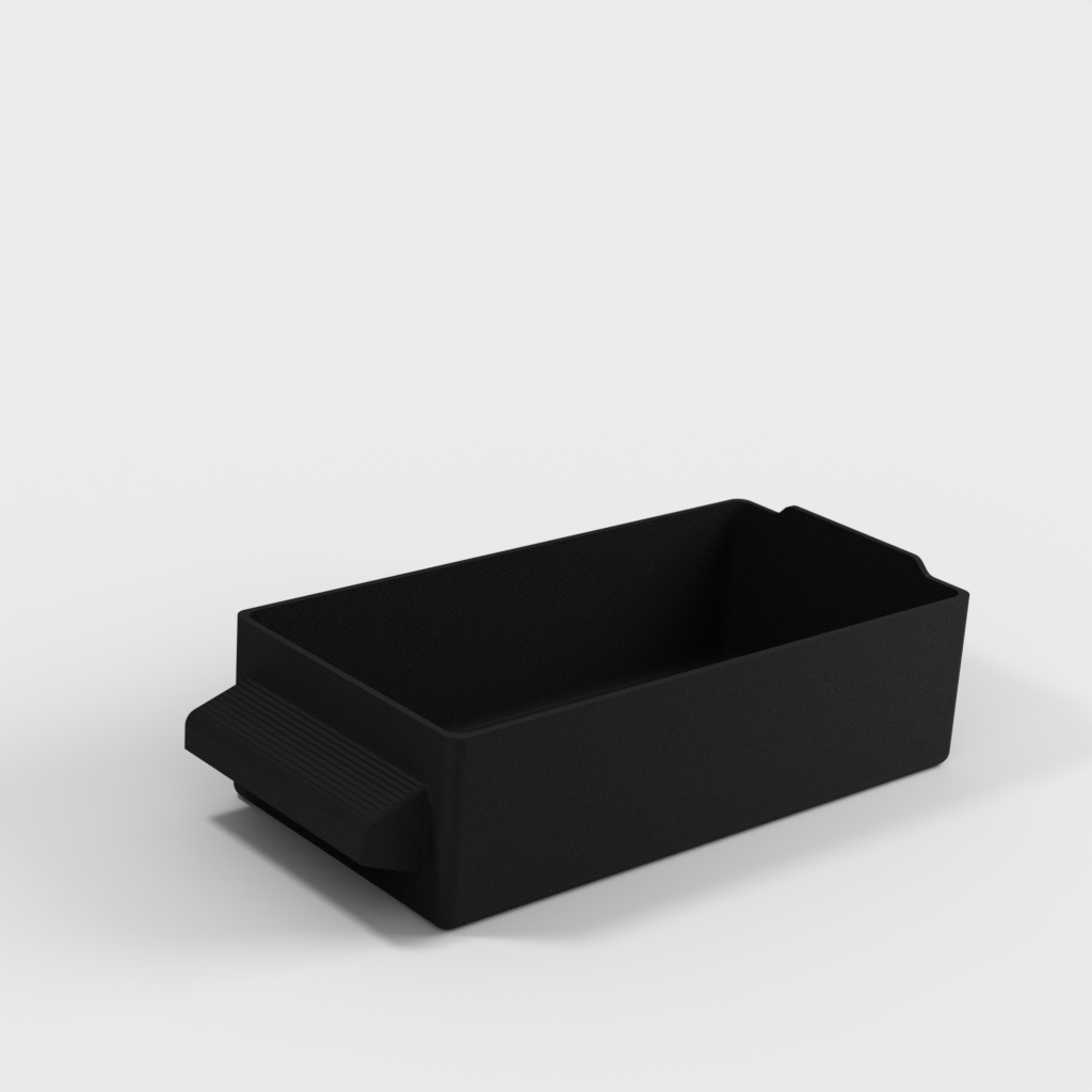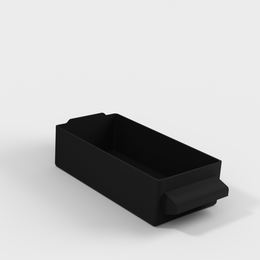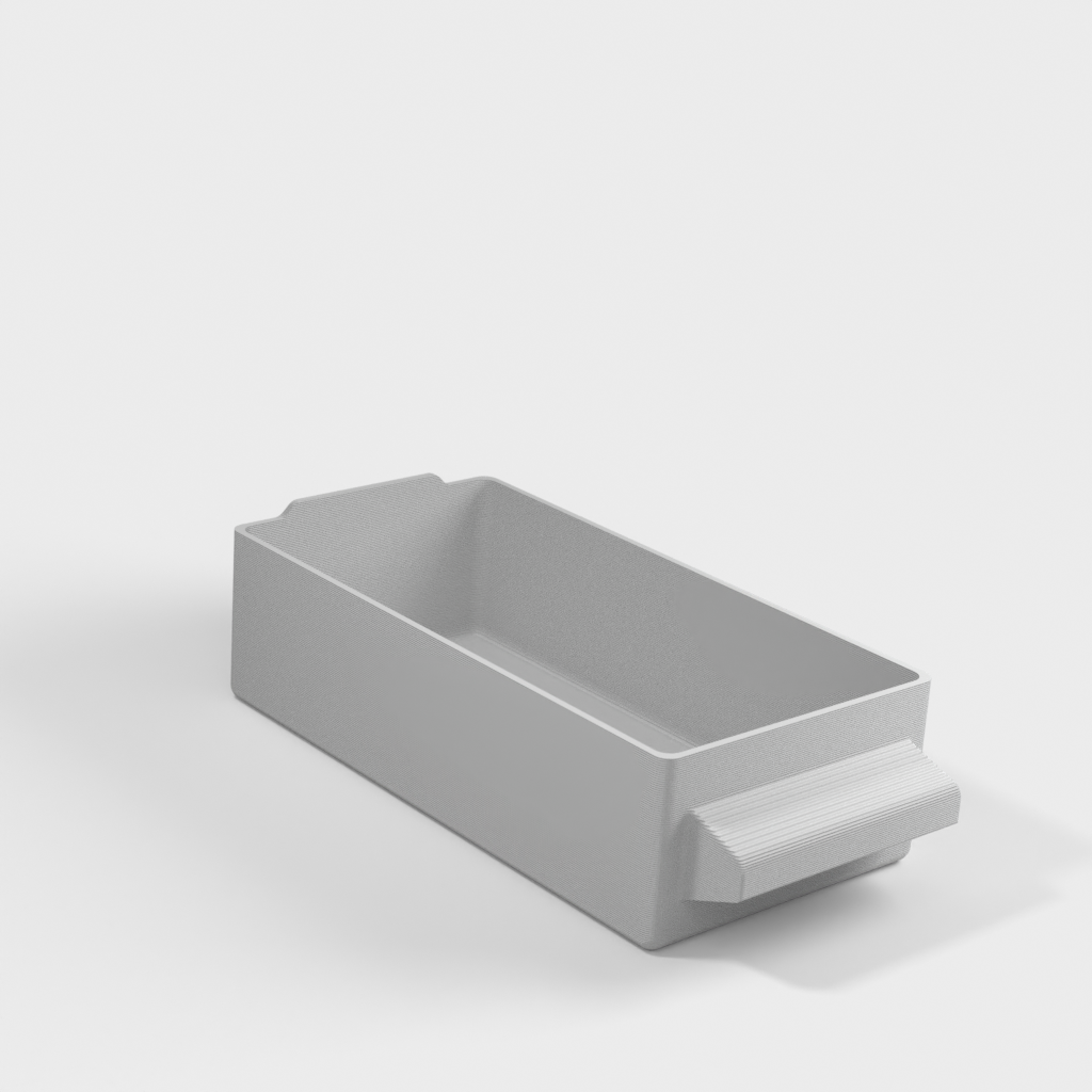 Con dimensioni esterne di circa 128x36x65 mm, il cassetto è adatto per un efficiente utilizzo dello spazio. È un'aggiunta funzionale per coloro che cercano una soluzione di archiviazione strutturata per piccoli oggetti in officina, nella sala hobby o in ufficio.