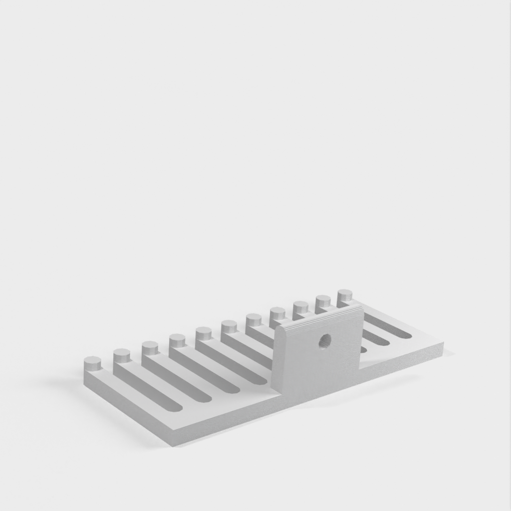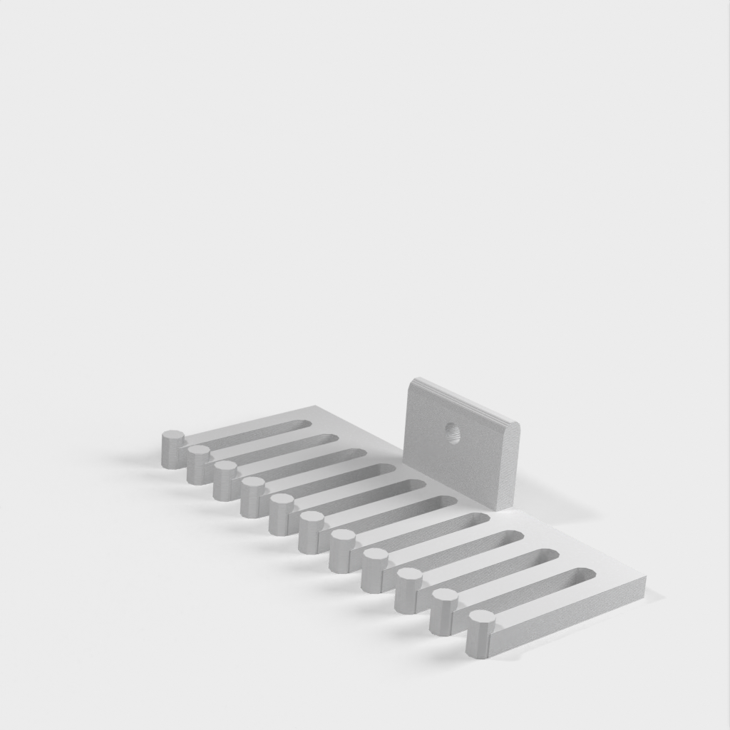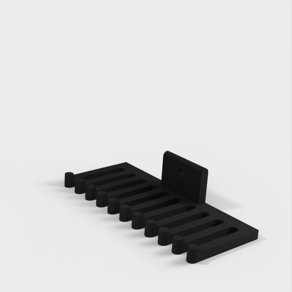 Portacavi che può essere fissato con una vite. Il portacavi ha la forma di un pettine, dove il numero di denti del pettine, l'altezza, la larghezza ecc. possono essere personalizzati a seconda delle esigenze. È possibile organizzare facilmente molti cavi diversi per creare uno spazio di lavoro ordinato.
