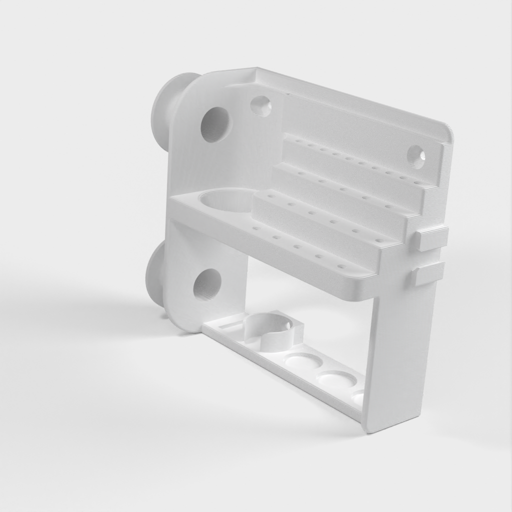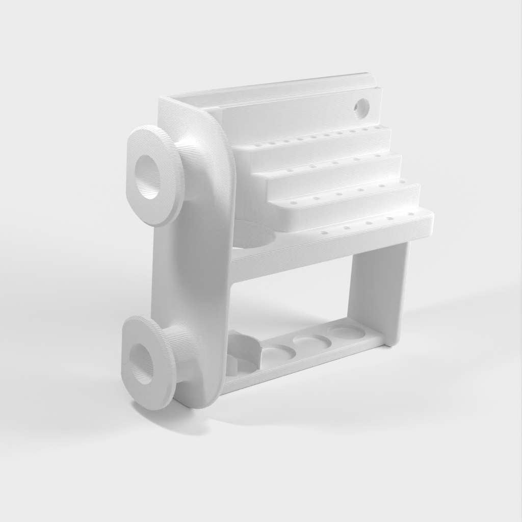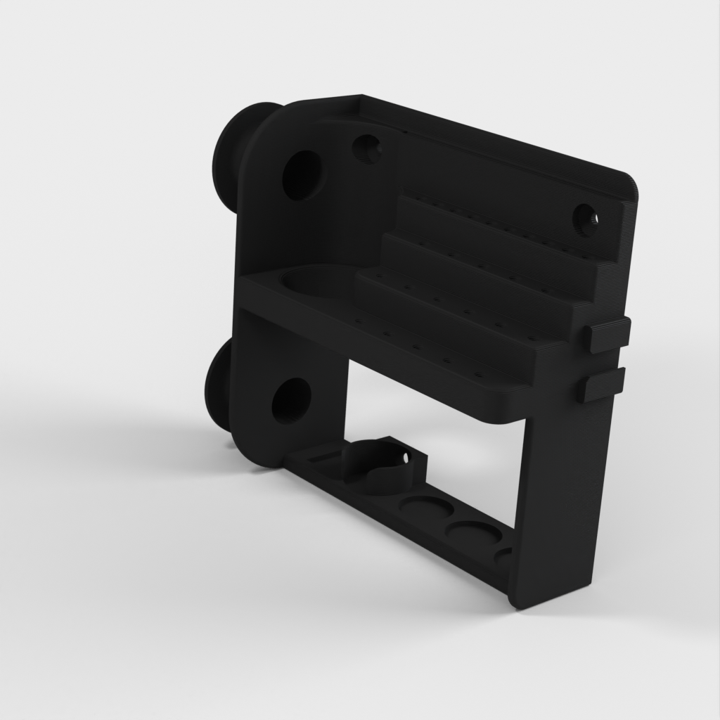 Semplice staffa a parete per, ad esempio, un utensile rotativo HobbyKing da 160 W o un multiutensile Dremel. C'è anche spazio per varie punte, mole da taglio, pasta per lucidare e quant'altro inclusi.