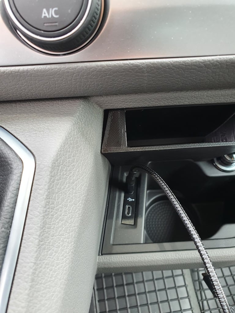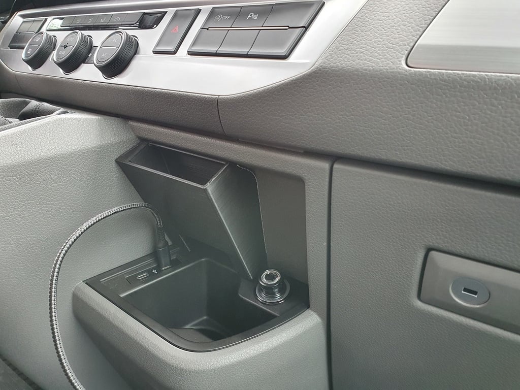 Questo supporto per cellulare è progettato per integrarsi discretamente nella tua VW T6.1 California o Multivan. È posizionato comodamente sopra l'hub USB dell'auto, creando uno spazio dedicato per il tuo smartphone. Ciò ti consente di riporre facilmente il telefono durante la ricarica tramite un cavo alla porta USB-C esistente sotto il supporto. L'installazione è semplice e avviene con nastro biadesivo, garantendo un posizionamento stabile e sicuro del dispositivo durante la guida. La soluzione contribuisce a un interno più organizzato e mantiene il telefono a portata di mano senza disturbare l'esperienza di guida.