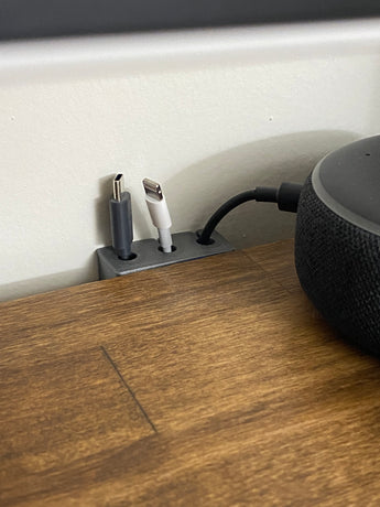 Questo portacavi è realizzato in TPU per garantire flessibilità. Si mantiene in posizione grazie al nastro adesivo e all'attrito tra la scrivania e la parete, garantendo una conservazione opaca e sicura dei cavi.