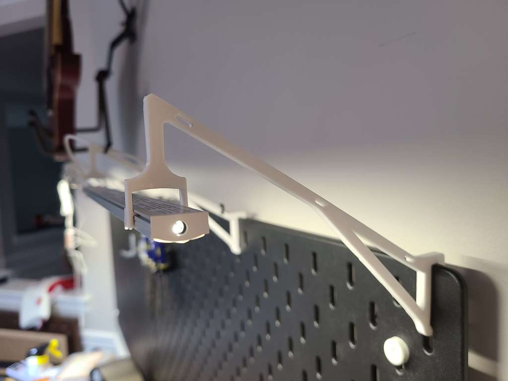 Questo morsetto/supporto è progettato per essere montato sulla parte superiore della scheda SKADIS e fornisce uno spostamento sufficiente per fornire una migliore illuminazione sulla superficie di lavoro anziché sulla scheda SKADIS.