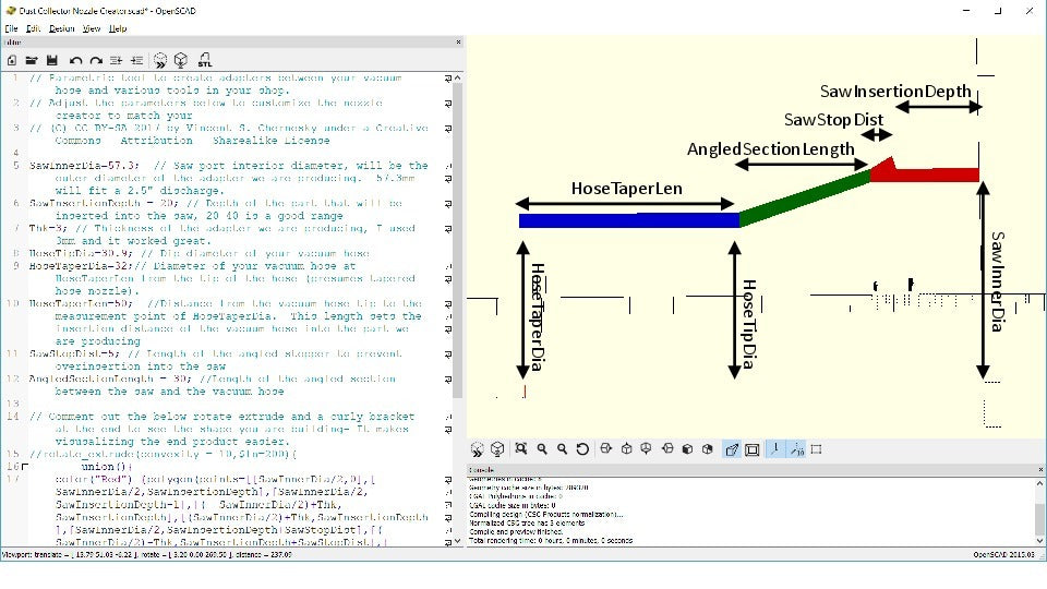 Generatore di adattatori per tubi flessibili parametrici per la creazione di interconnessioni personalizzate tra un aspirapolvere da officina e diverse porte di raccolta della polvere. Progettato per collegare un aspirapolvere da officina a una sega da tavolo Dewalt.