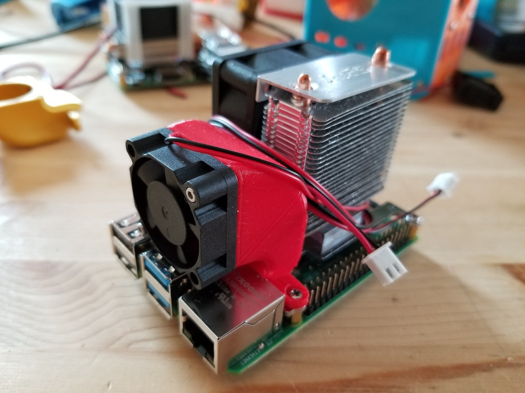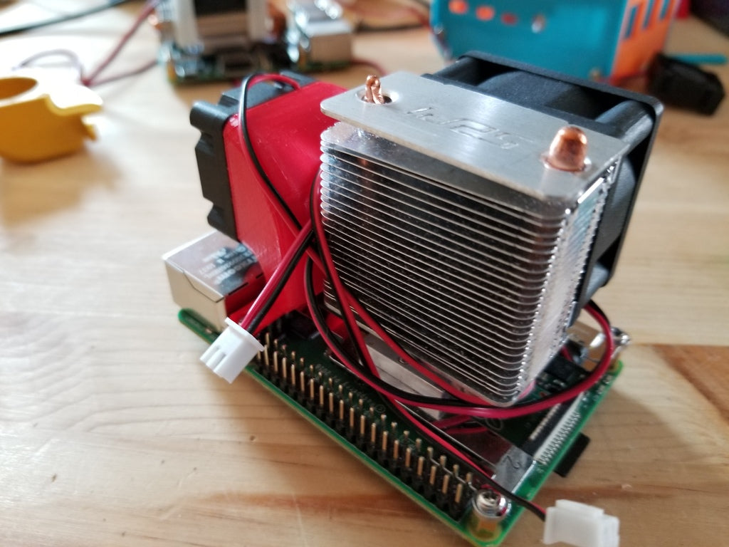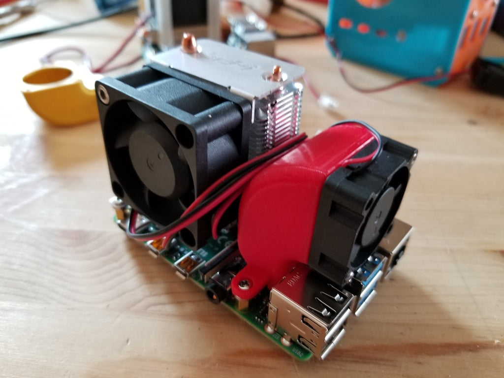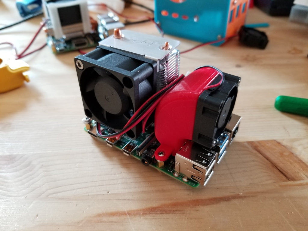 L'idea della ventola secondaria è quella di soffiare l'aria tra la parte inferiore del dissipatore Ice Tower e il PCB del Pi, raffreddando le altre parti sul PCB e raffreddando ulteriormente il dissipatore soffiando l'aria oltre i tubi di calore.