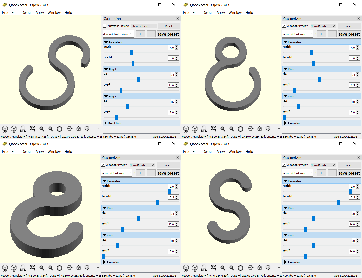 Ganci a S personalizzabili OpenSCAD per bagno e cucina