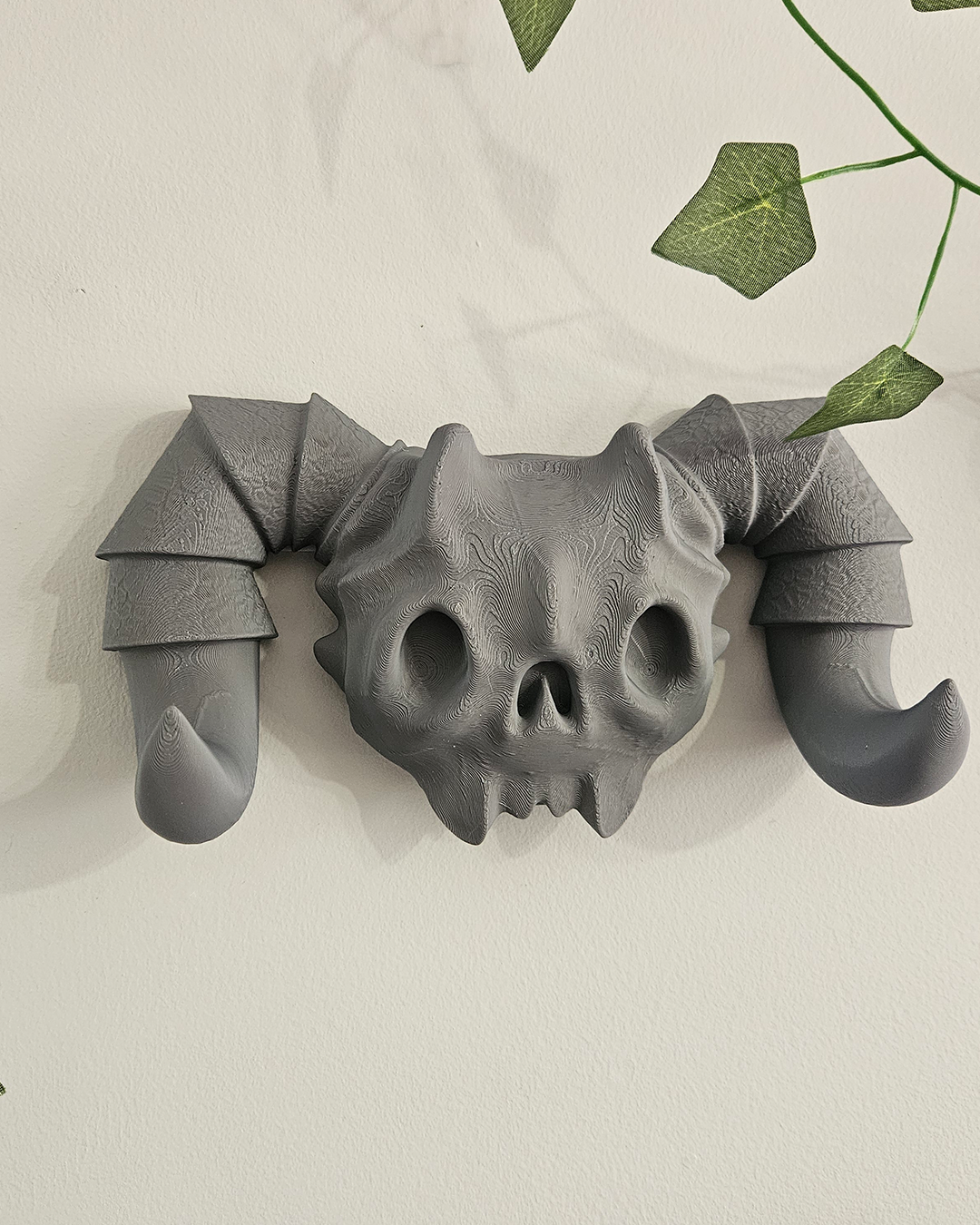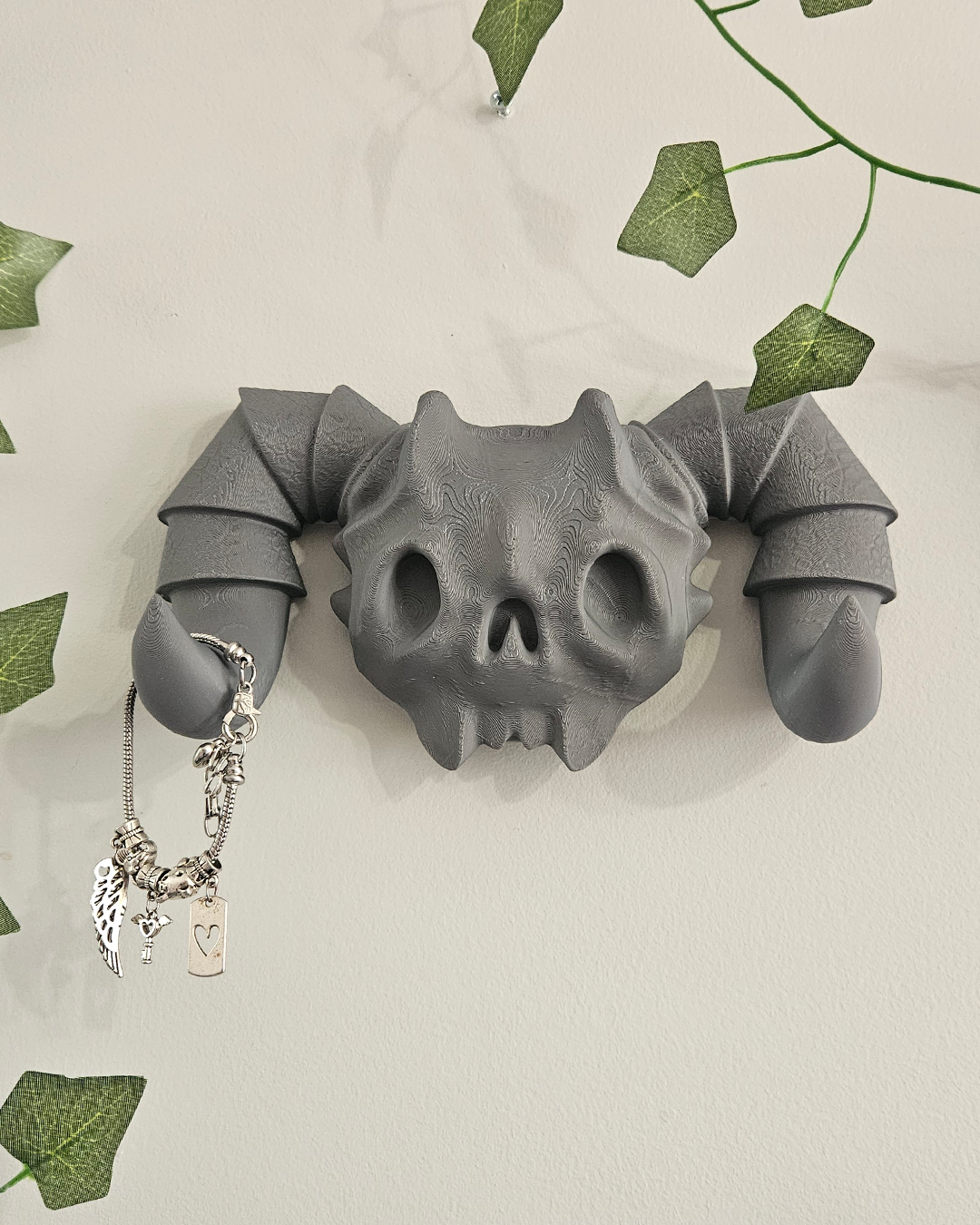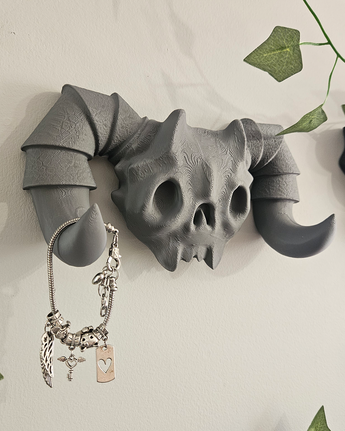 Aggiungi un elemento unico e accattivante al tuo arredamento con questo gancio da parete a forma di teschio di demone. Questo dettagliato teschio con corna funge sia da entusiasmante oggetto decorativo che da pratica soluzione per lo stoccaggio.