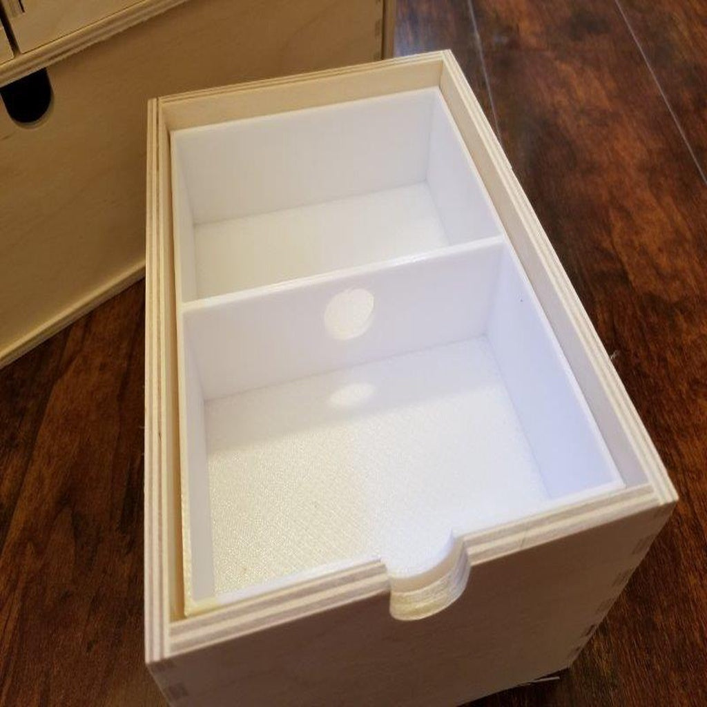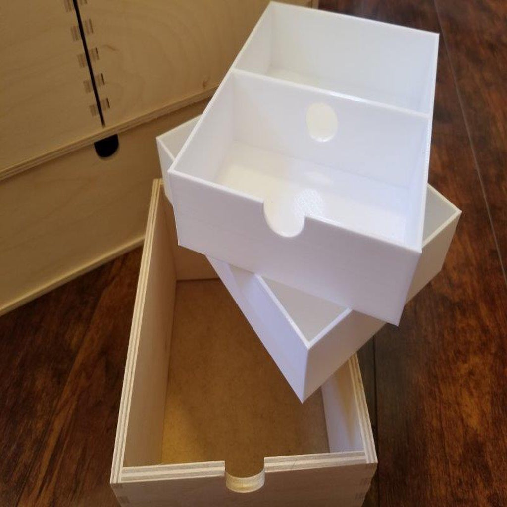 Questi sono organizzatori di inserti per cassetti Ikea MOPPE. Questi si adattano ai cassetti più piccoli dell'organizer Moppe. La parte inferiore e quella superiore sono identiche, tranne la parte superiore, che ha una tacca per la maniglia del cassetto.