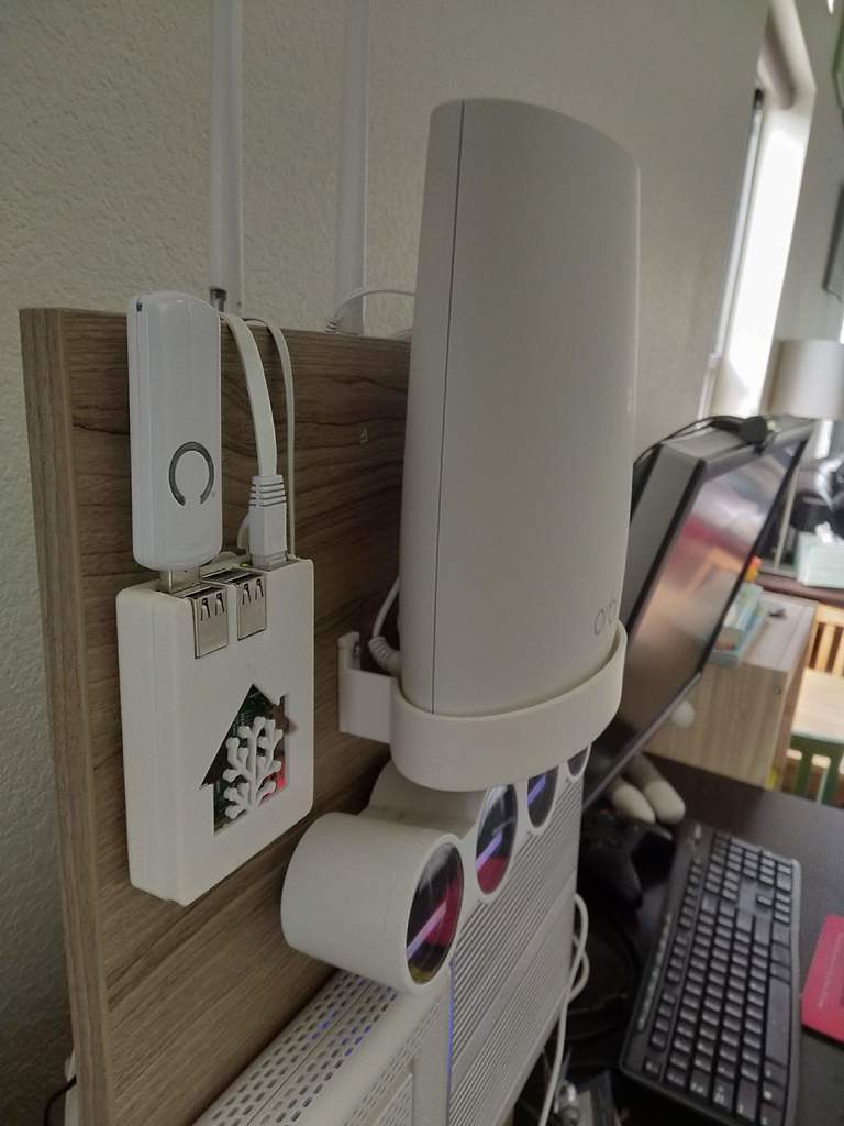 Con la sua forma compatta, la staffa si adatta discretamente a qualsiasi stanza. L'intelligente struttura a griglia nella parte inferiore garantisce una ventilazione continua ed efficiente, essenziale per mantenere le prestazioni del dispositivo e prevenire il surriscaldamento. Questo design supporta il funzionamento ottimale del router Orbi e ne prolunga la durata.