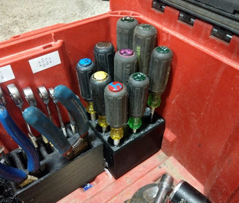 L'organizer è stato inizialmente dimensionato per ospitare una serie di cacciaviti comuni, tra cui quattro cacciaviti Greenlee e cinque cacciaviti per dadi Klein. Questo supporto per cacciavite assicura che i tuoi utensili siano saldamente in posizione e impedisce loro di giacere sparsi nella scatola.
