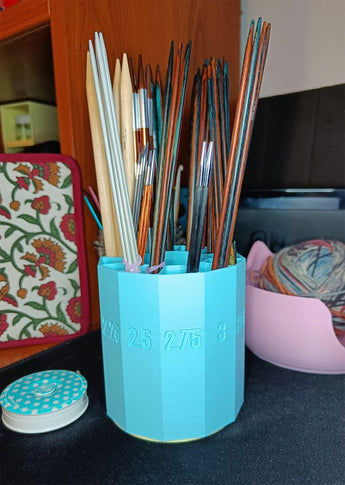 C'è una versione con le dimensioni degli aghi da maglia incise su ogni scomparto esterno, ma è fatta con le dimensioni degli aghi che ho io, quindi potreste volerla personalizzare con dimensioni diverse. Ho aggiunto anche il file .f3d nel caso in cui vogliate modificarlo per adattarlo alle vostre esigenze.
