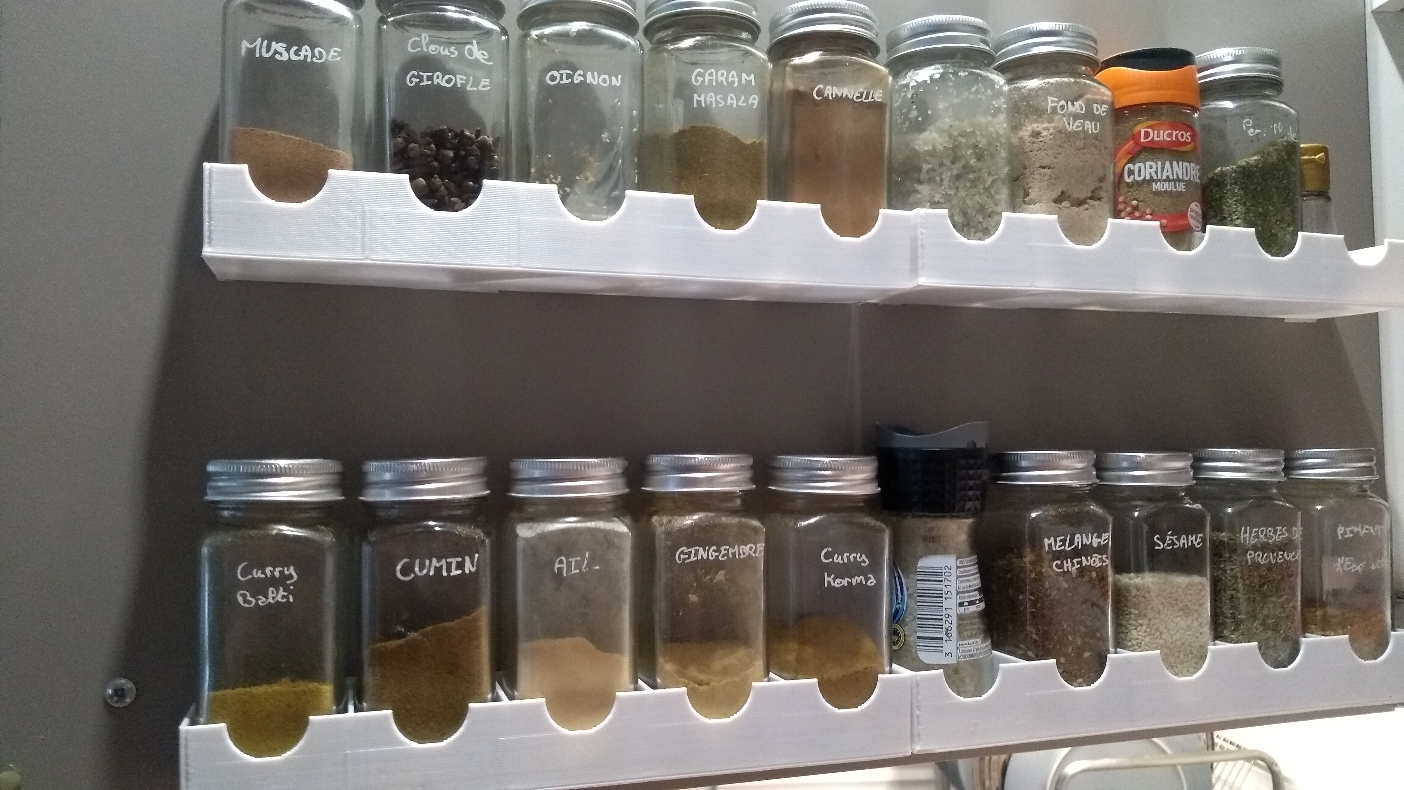 Questo portaspezie può essere facilmente montato sulle ante degli armadietti utilizzando un nastro biadesivo per una conservazione facile e comoda. Può essere personalizzato in base alle vostre esigenze specifiche utilizzando OpenSCAD e può contenere bottiglie quadrate da 45 mm.