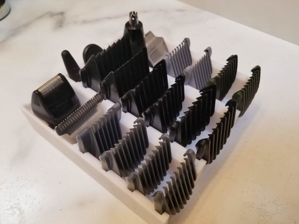 Che tu possieda un modello Philips Multigroom 7000, 5000 o 3000, questo vassoio per accessori si adatta perfettamente alla maggior parte dei tuoi strumenti di styling. È progettato con scomparti per tutte le testine, incluso un posto per la testina appena rimossa dal rasoio Philips, rendendo la sostituzione facile e senza problemi. Lo spazio extra tra i pettini più grandi assicura che si adattino in modo ottimale e siano facili da afferrare.