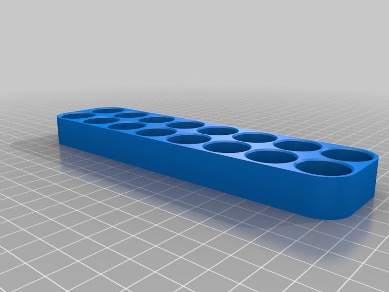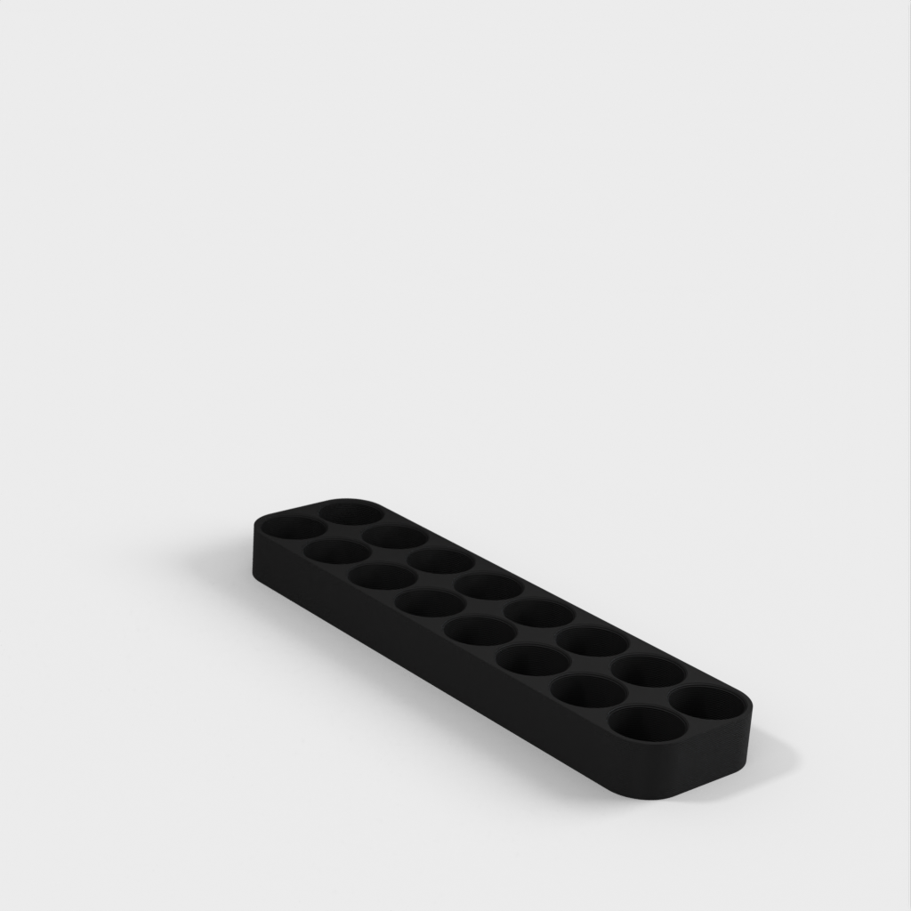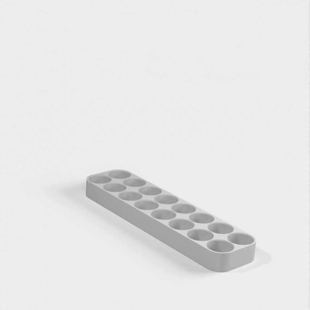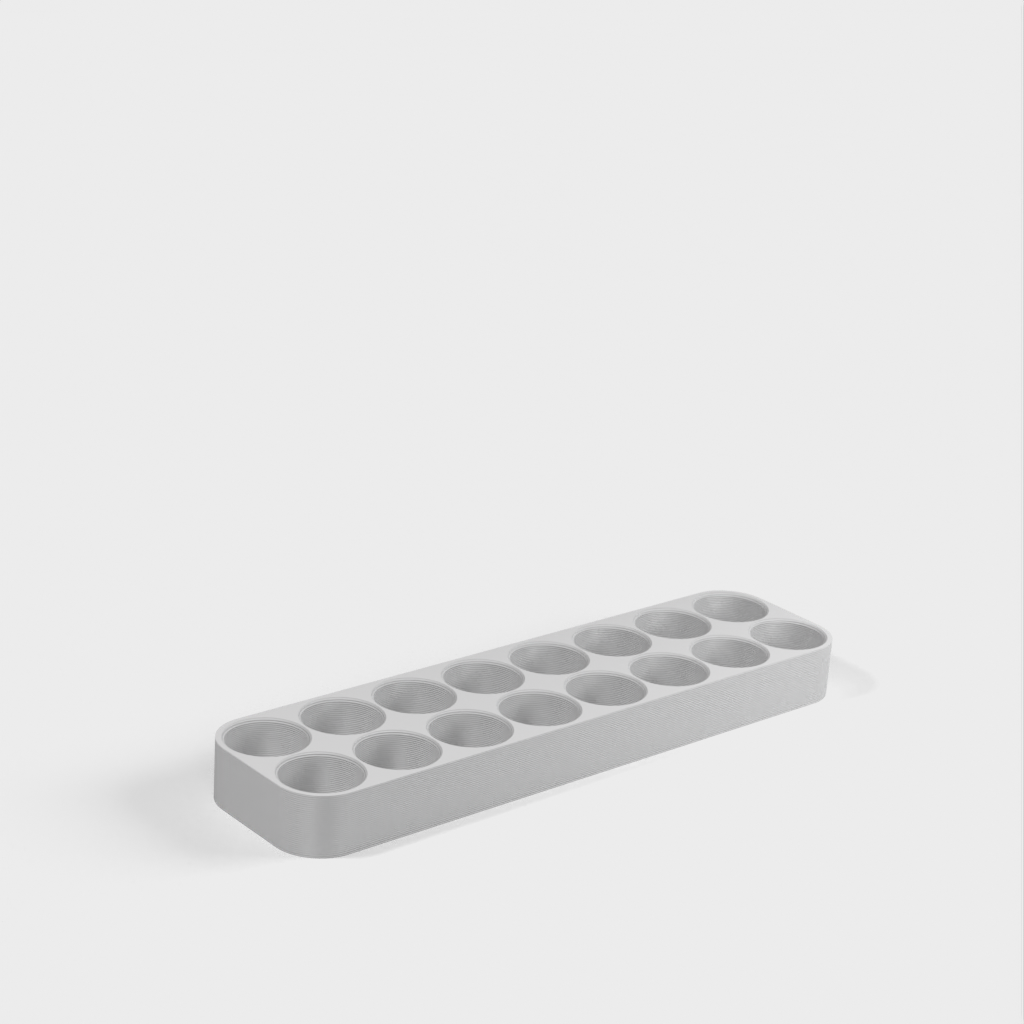 Questo è un semplice portabatterie 18650 per riporlo su uno scaffale o un tavolo. Il design è regolabile tramite OpenSCAD, quindi le dimensioni, il margine di sicurezza e il numero di batterie possono essere personalizzati secondo necessità. Il file stl allegato è progettato per 16 batterie.