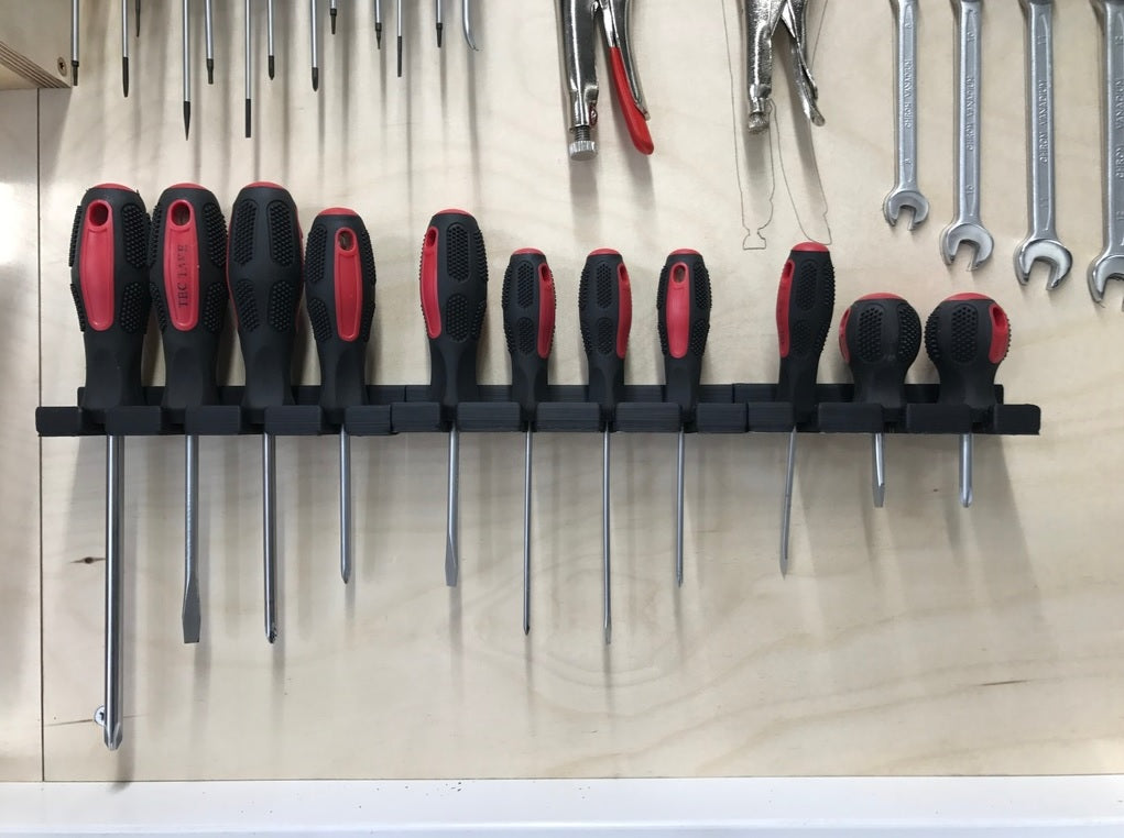 Si tratta di un supporto per cacciaviti da montare a parete. Il supporto può essere facilmente montato direttamente a parete con 4 viti. I cacciaviti possono quindi essere facilmente collocati nel supporto, rendendo più ordinata l'officina, il capannone o il veicolo da lavoro.