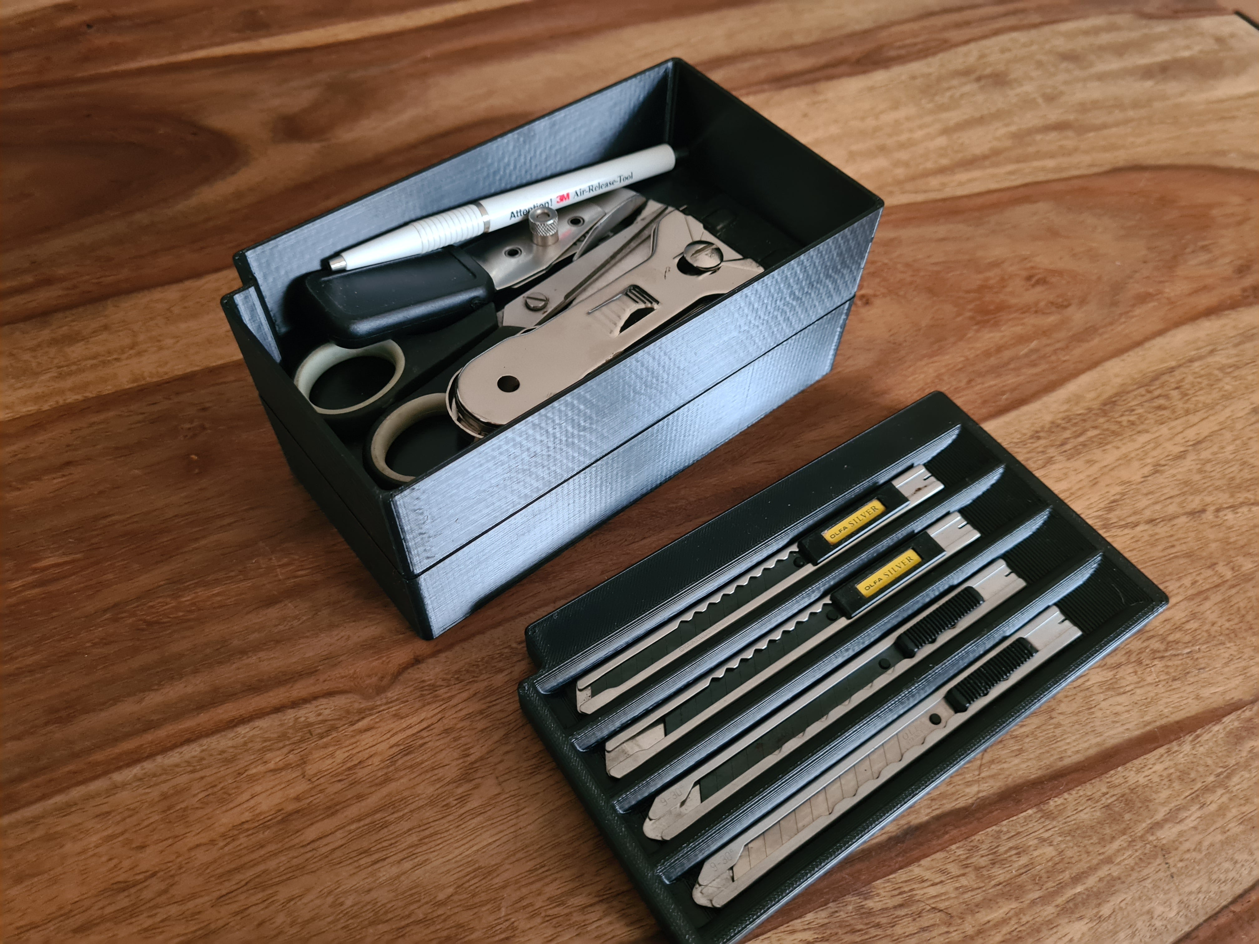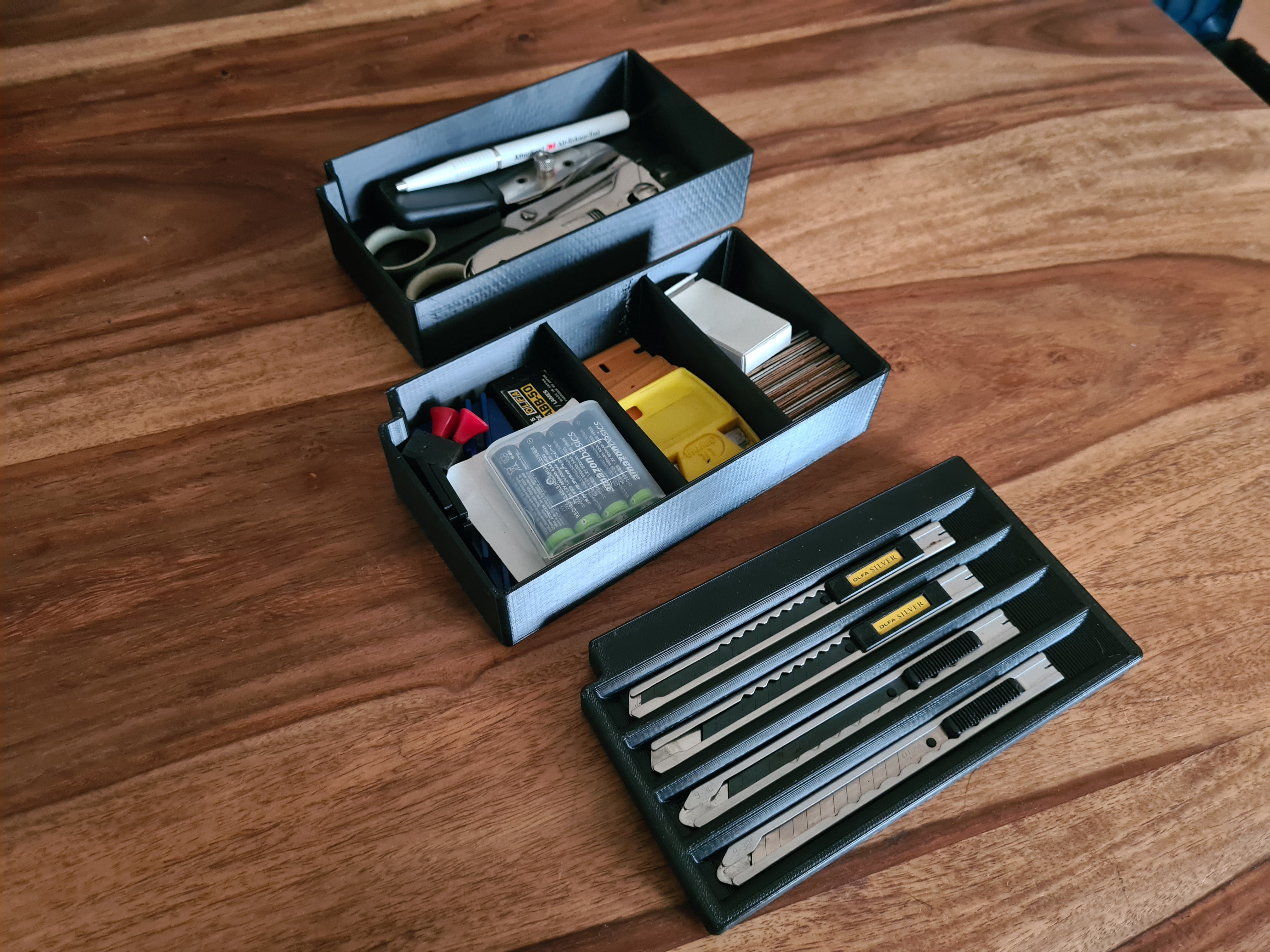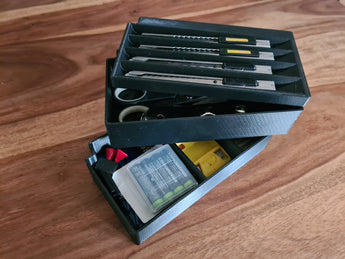 La scatola è suddivisa in pratici scomparti, uno dei quali è dedicato al tuo taglierino per un accesso rapido e sicuro. Inoltre, contiene due ulteriori vani portaoggetti, ideali per organizzare caricatori di ricambio, lamette da barba, piccole batterie o altri materiali di consumo simili. Le scatole modulari inferiori possono contenere altri strumenti speciali, contribuendo a uno spazio di lavoro ordinato ed efficiente.