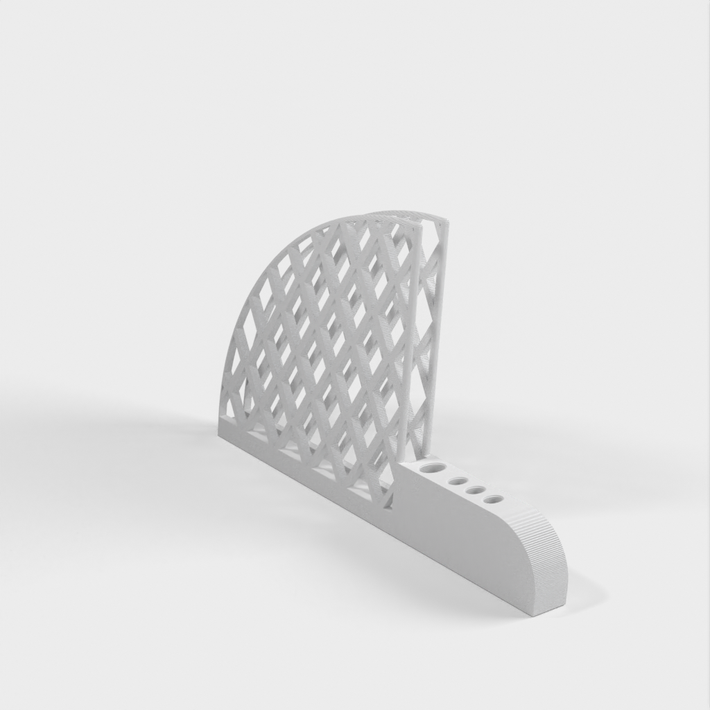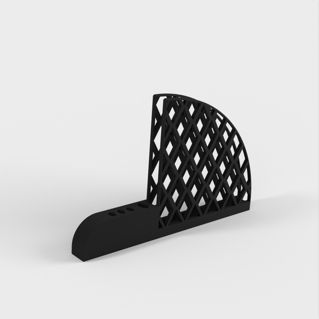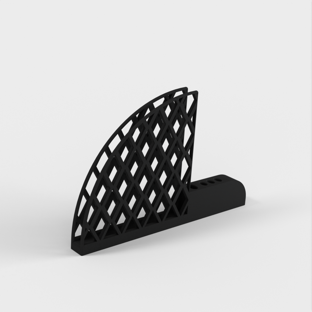 Porta filtro e cucchiaino per caffè progettato per i filtri Hario V60. Ha un grande foro per il cucchiaio per adattarsi a un manico ellittico da 5 mm x 10 mm e tre piccoli fori per adattarsi a un cucchiaio da 3 mm x 6 mm. Ogni foro ha un offset di 1 mm per adattarsi allo spazio. Il prodotto pesa 67 g e la stampa richiede circa 13 ore.